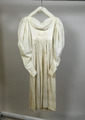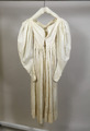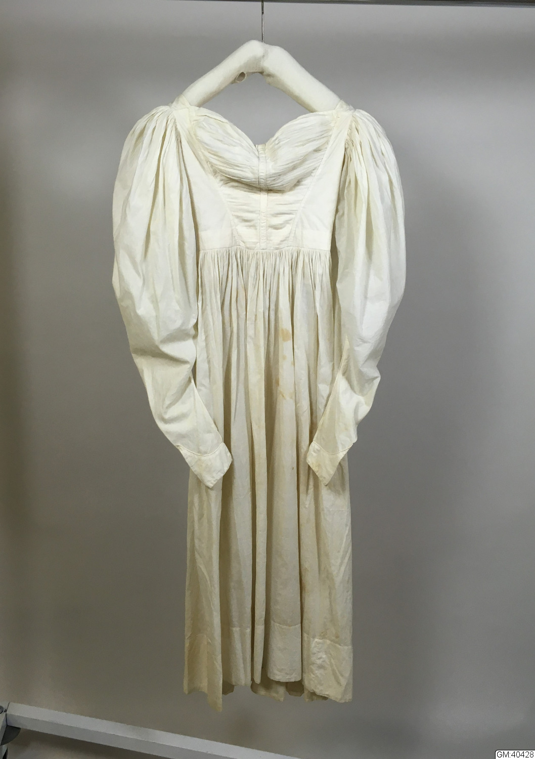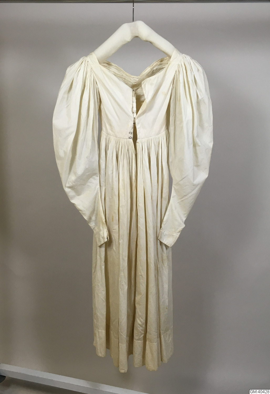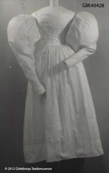 - Av vit bomullsbatist, båtringad ( rektangulär ringning) , lång fårbogsärm med med manschett. Manschetterna har en spets som pekar uppåt mot armen. Kjolen fållad med en skoning som är 11,5 cm bred, stygnmärken horisontellt längs kjolens fåll, tre rader 10, 28 och 44 cm från nederkanten dessutom stygnmärken och veck för ett 2.5 cm djupt veck 31,5 cm från nederkanten. Förutom midjesömen och sidsömmarna är alla livet sömmar paspoalerade. Framtill på livet ett triangulärt parti med horisontella veck lagda uppåt. Lodrät längs mitten är vecken låsta av en ca 1 cm bred passpoalerad remsa. Utom under veckpartiet är livet fodrat, knäppning i ryggen med små hakar och sydda tränsar.Midjebandet knäpps med större hyskor och hakar, två par.