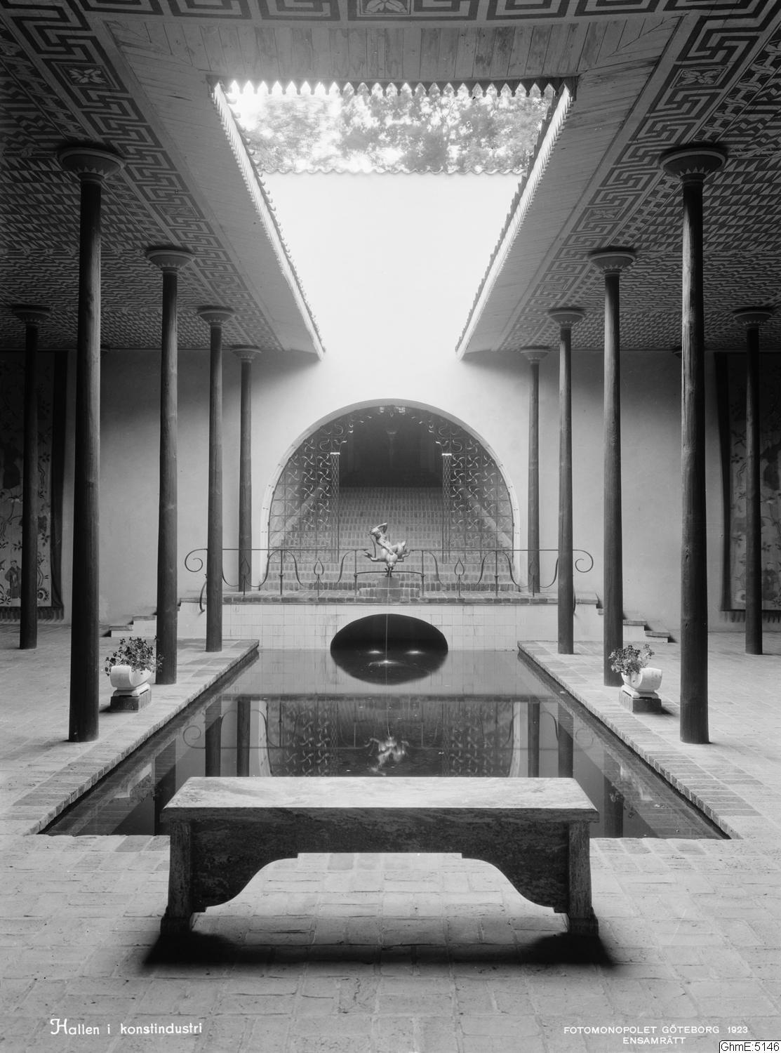Avdelningen för konsthantverk och konstnindustri, rum 2, gård med damm. Marmorbänken i bildens framkant kommer från Nya Marmorbruks AB i Kolmården, formgiven av Hakon Ahlberg. Smidesarbetet till gallergrindarna formgivet även det av Hakon Ahlberg, arbetet utfört av K. Petrelius Smides-& Mekaniska Verkstad, Stockholm. I bildens mitt ovanför dammen syns Carl Milles bronskulptur Solglitter.