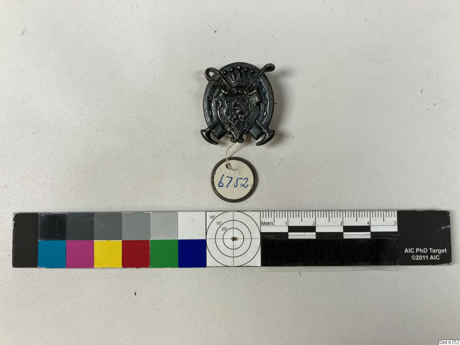 Ett märke för "Göteborgs fältridklubb", komponerar med Göteborgs vapen, hästpoloklubba, ridspö, hästsko samt en öppen krona. Broschnål på frånsidan.
