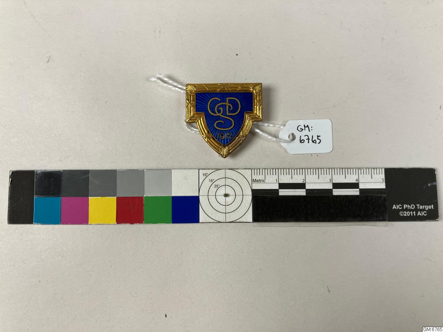 Ett märke med blå emalj för Göteborgs Damers Simsällskap, 1912