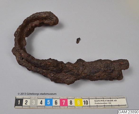 - spjutspetsen var av järn hopböjd i vertikal ställning, holken skadad 16.6 cm l. Spjutspetsen var alldeles höljd i ett skickt av sand och stenar fast hopkittade med järnet genom rost. Låg vid kanten av urnan åt SÖ utanför men omedelbart upp till urnans buk. Ber nr 2