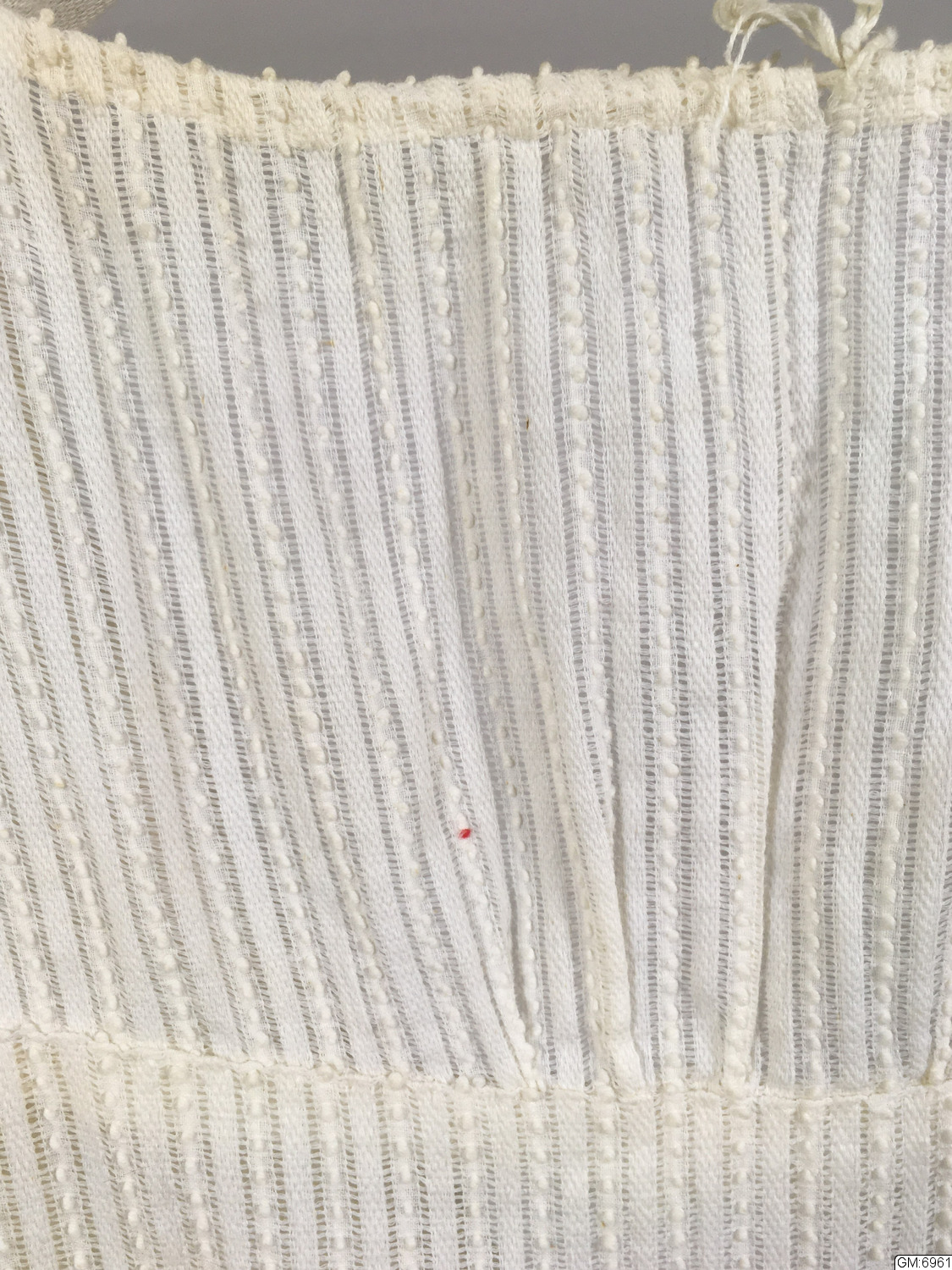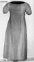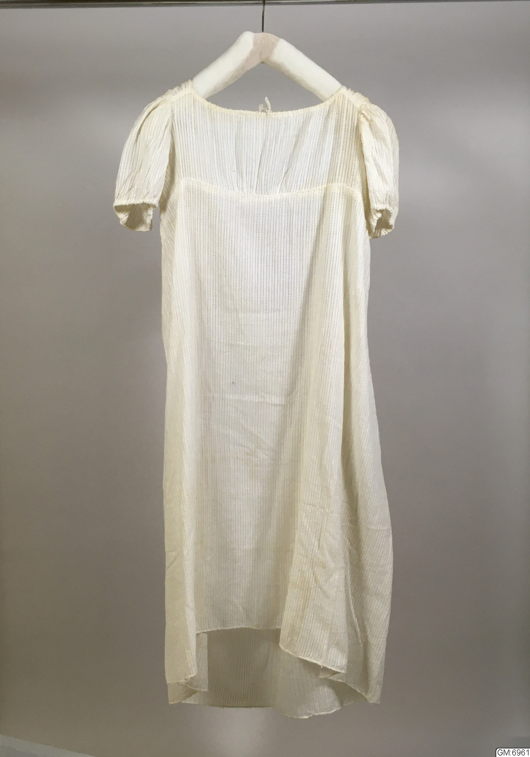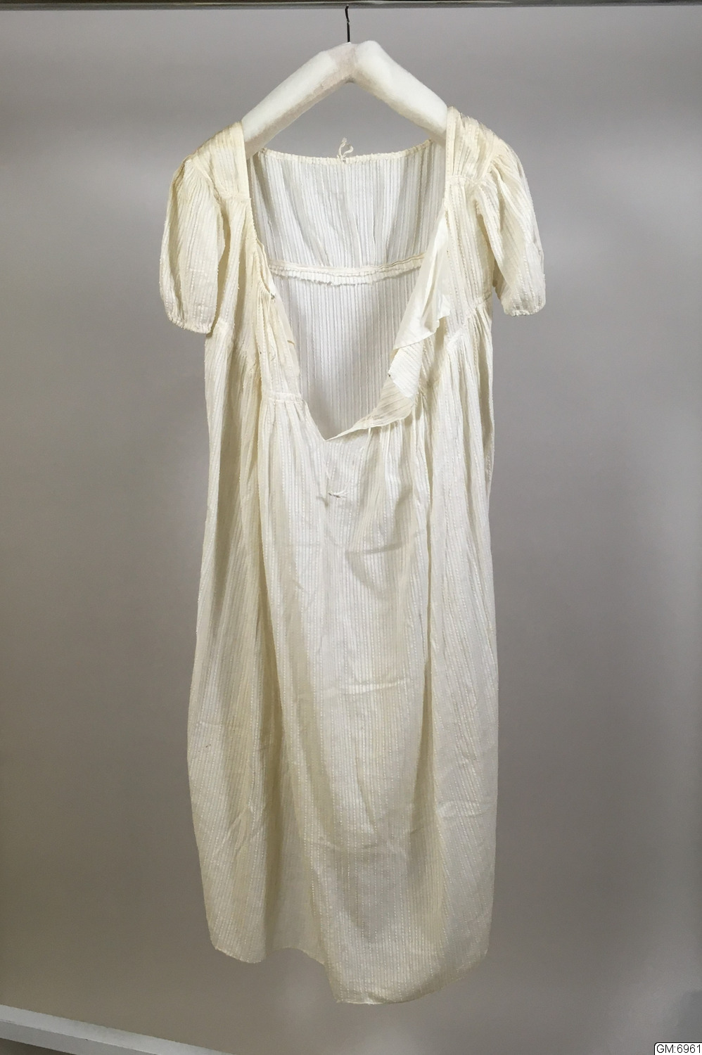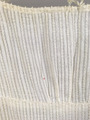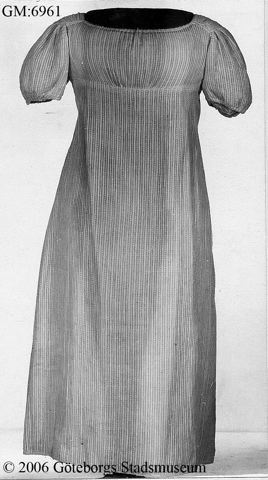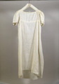 I tre stycken. Dragsko i urringningen fram och bak samt i livets underkant bak. Sammanhålles bak av vitt bomullsband löpande i dragsko. Bakstyckerna med löst foder av vitt bomullstyg. Förstärkning av vitt bomullsband fastsydd fastsydd i framstyckets nederkant. Korta puffärmar med dragsko i kanten.