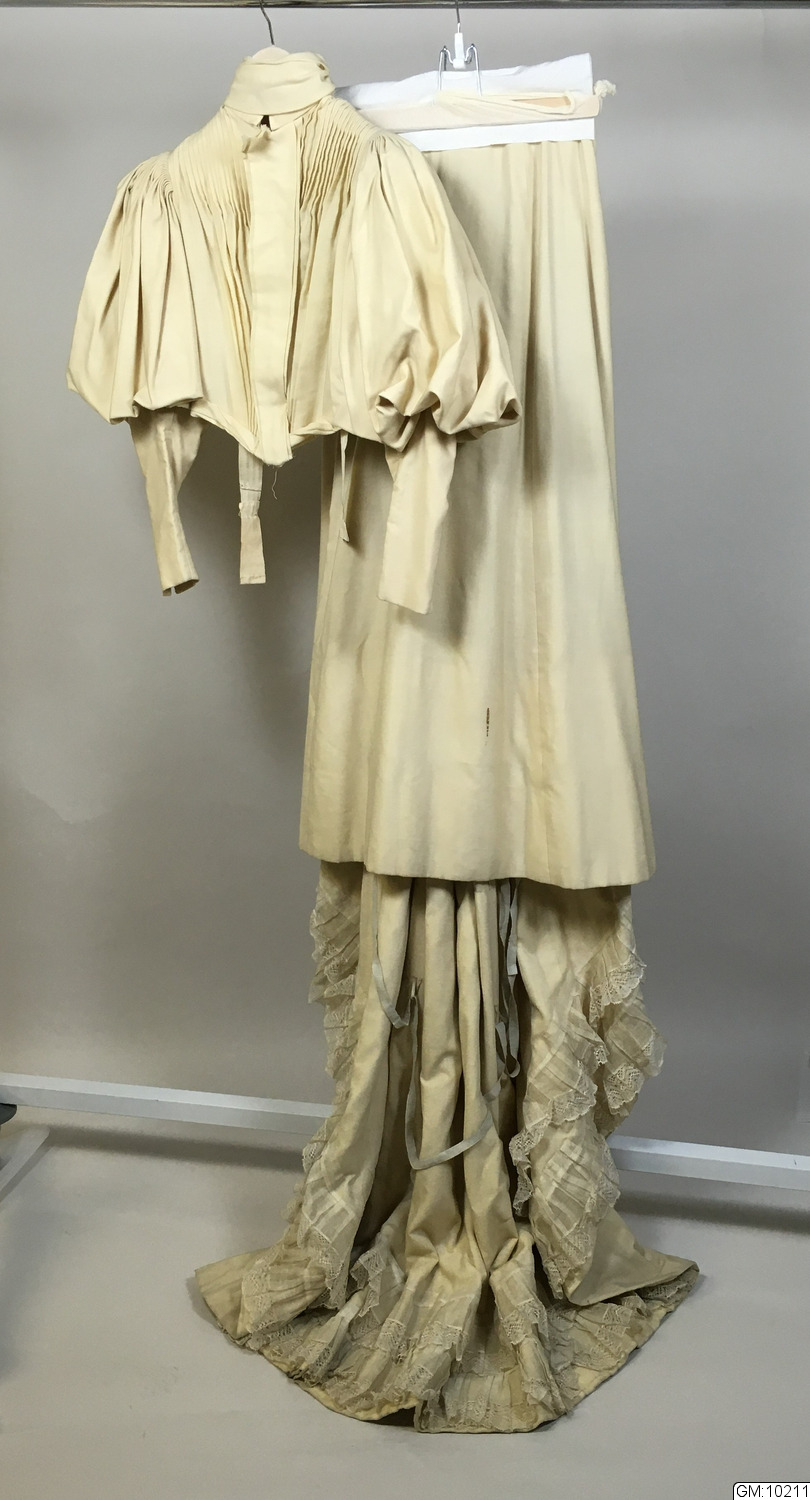 Brudklänning bestående av liv och kjol i vitt ylle. Livet har hög hals, vertikala lagda veck på framstycket och stora fårbogsärmar med smala, åtsittande underärmar. Kjolen är vid och klockad, med långt släp baktill.