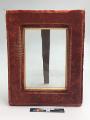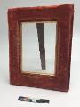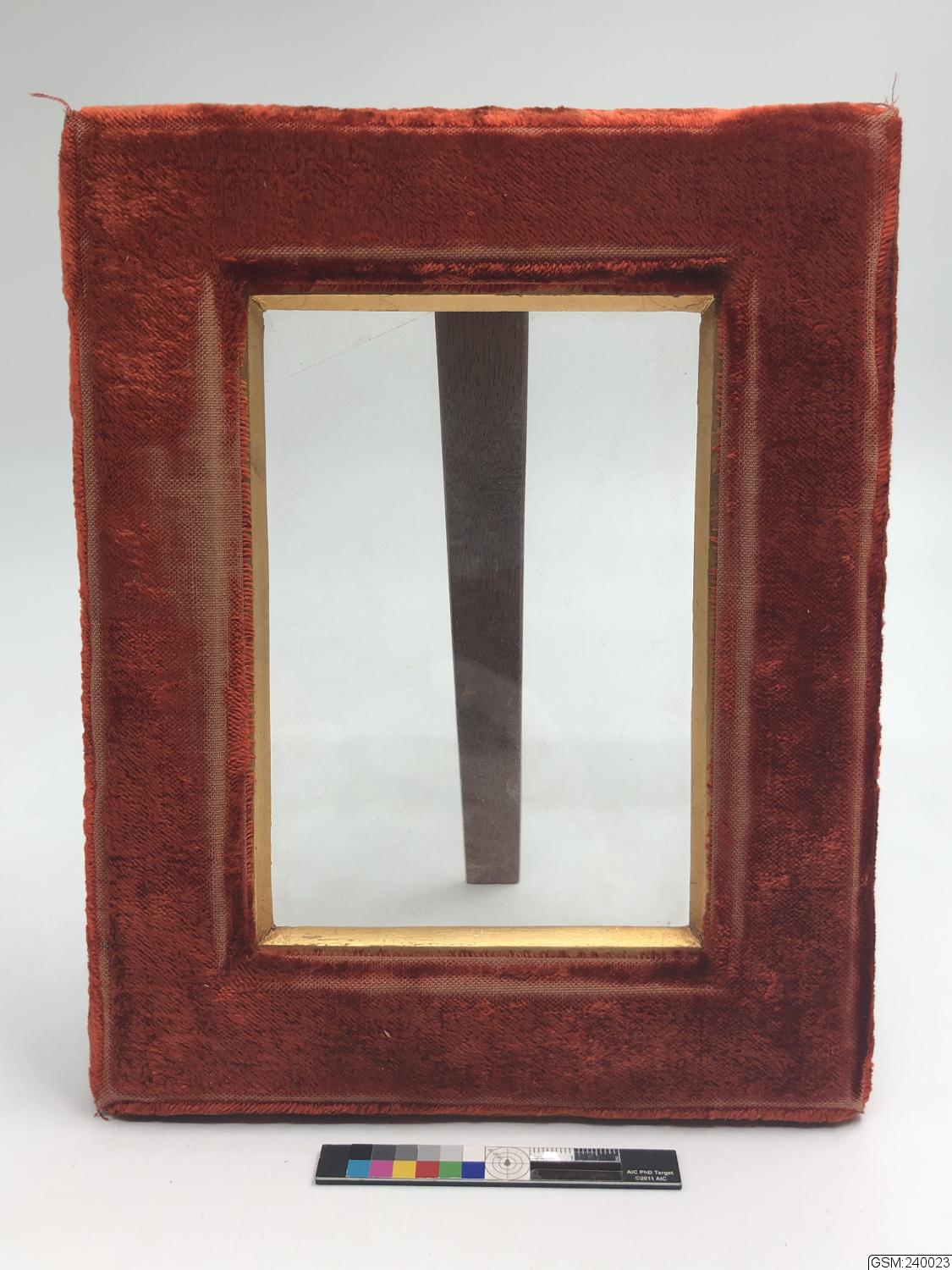 - Röd sammet klädd träram med en lös glasskiva. Färgen färgar av sig.