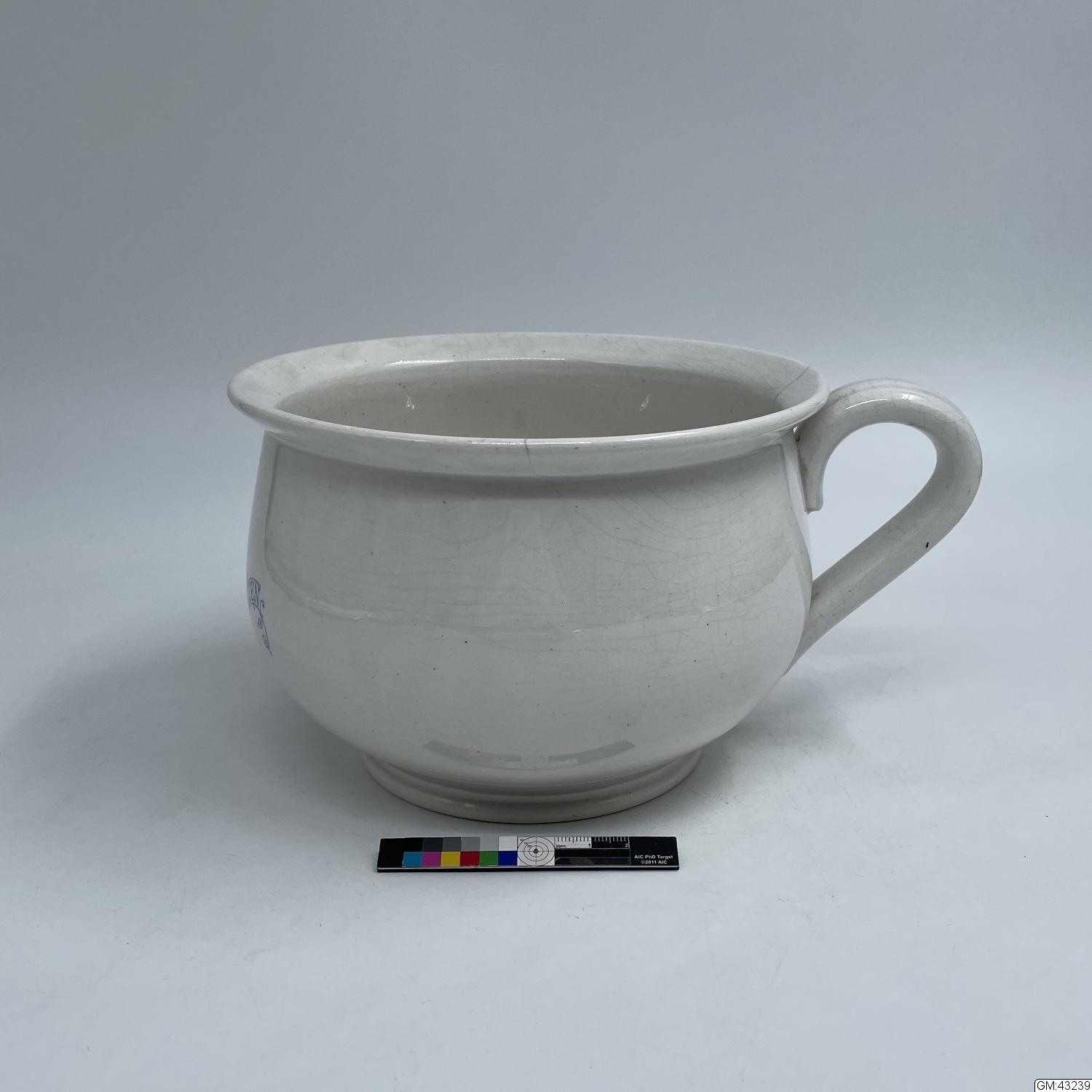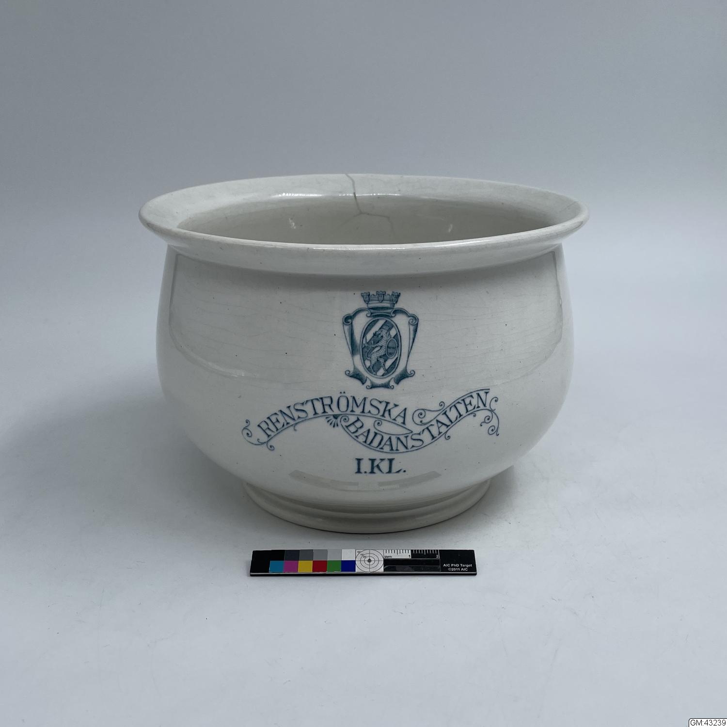 Potta i porslin med texten "Renströmska badanstalten"