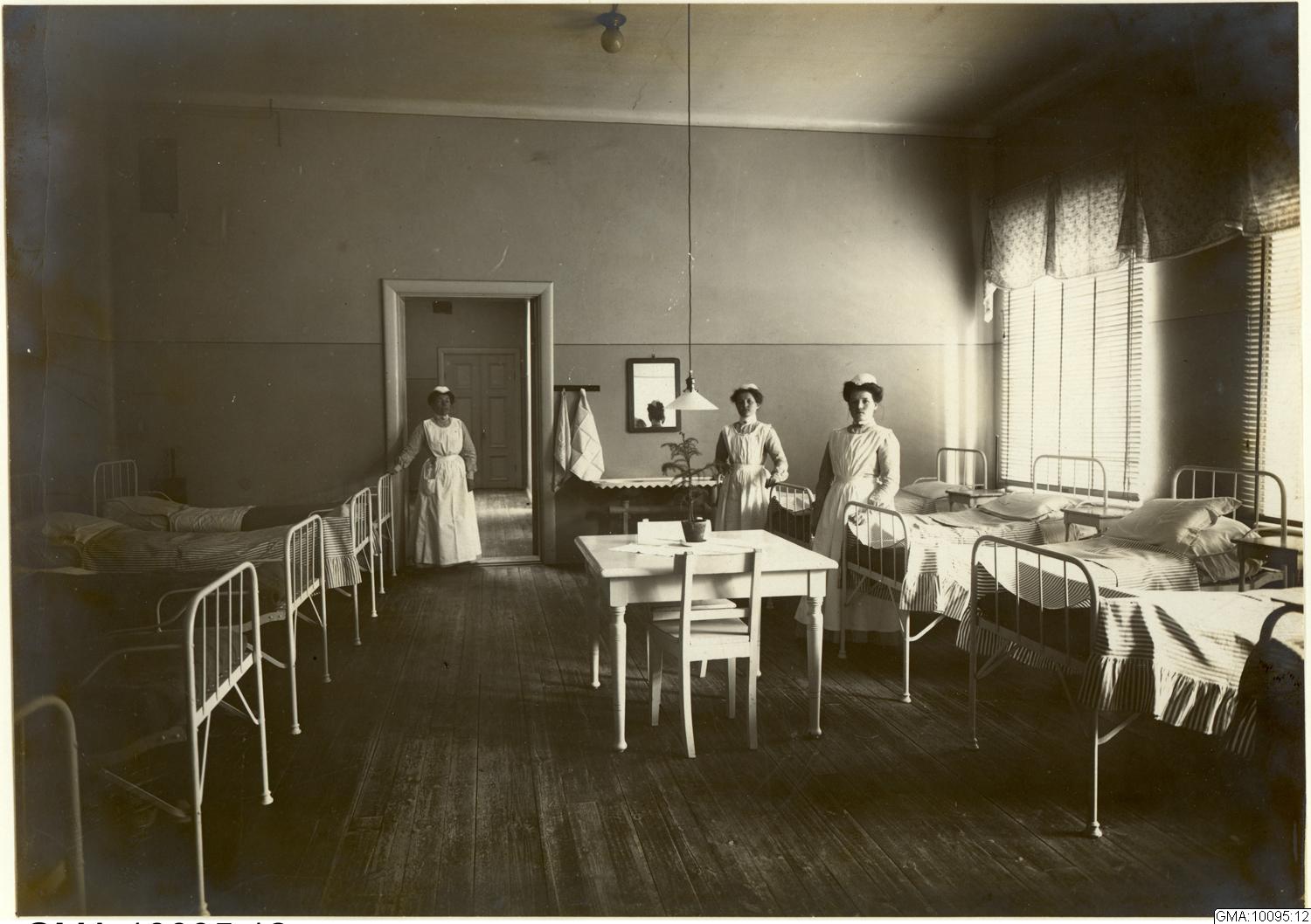 - "Öfvervakningssal" med 3 sjuksköterskor på Sankt jörgens sjukhus.