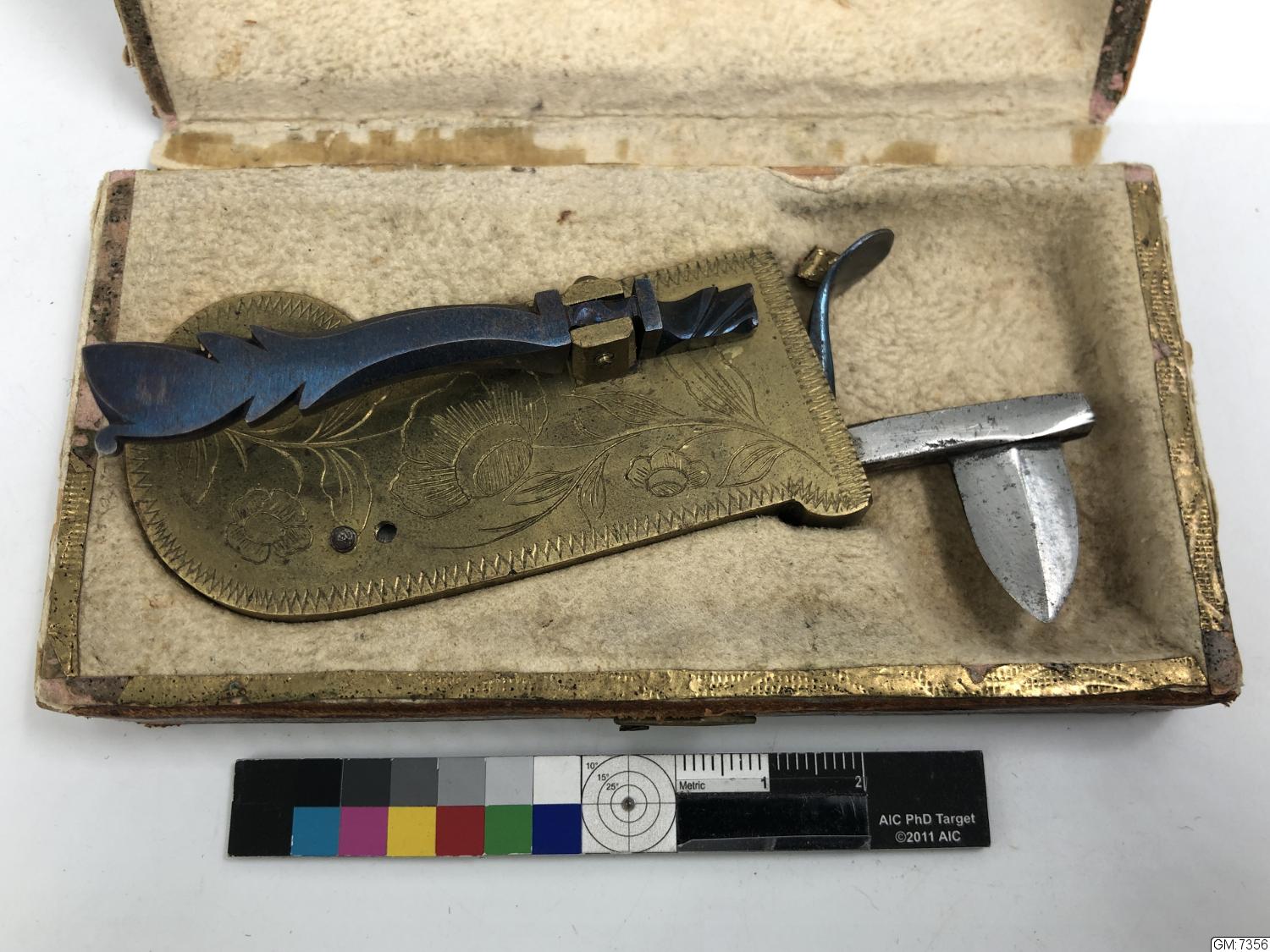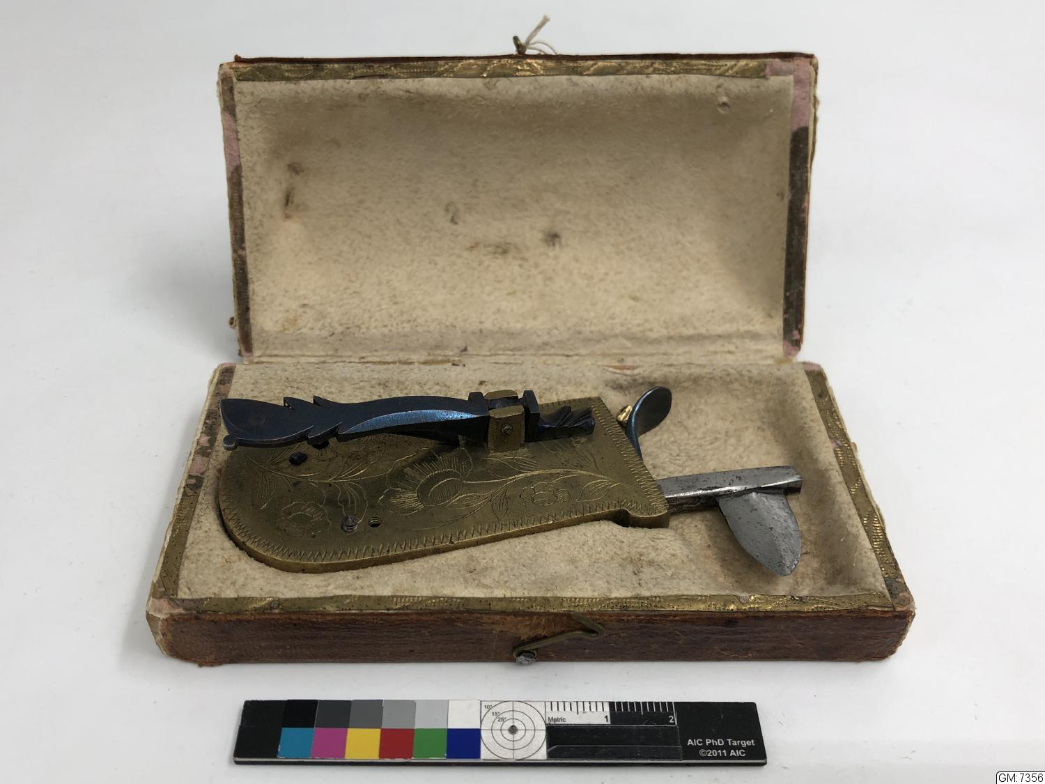 Åderlåtningsinstrument av stål och mässing, graverat med blomstermotiv. Fodral av trä klätt i rött, blekt skinn, invändigt klädd med sämskskinn.