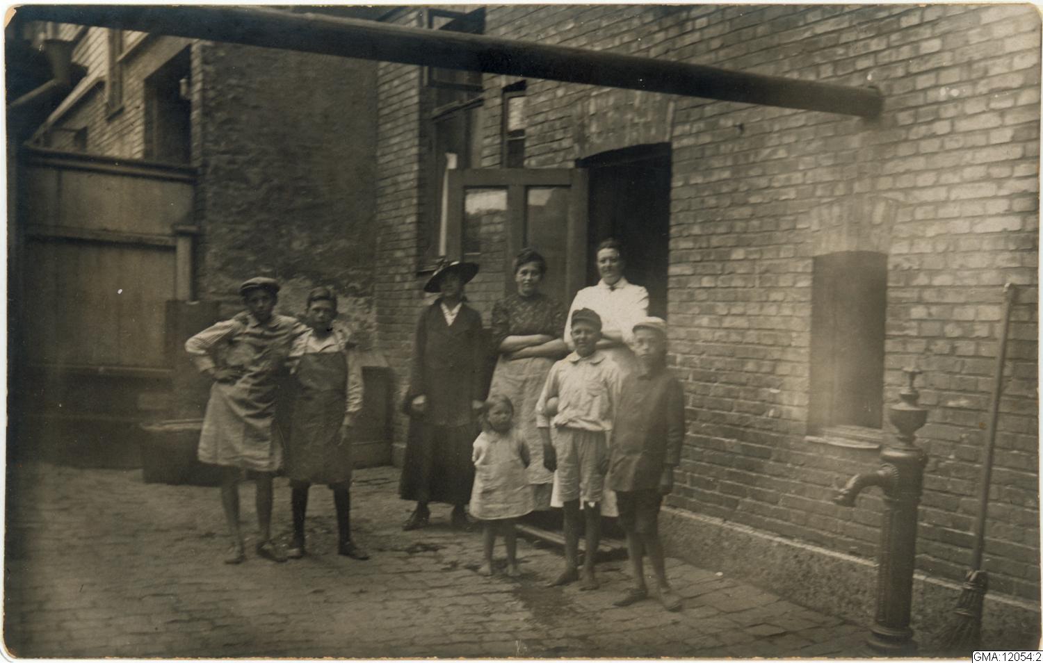- Fotot visar innergård på Kaponjärgatan, med 3 kvinnor och 5 barn i varierande ålder.