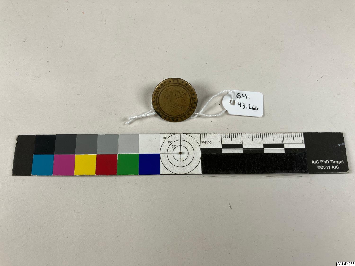 flat mässingsknapp med dekor av dubbla linjer och punkter längs ytterkanten