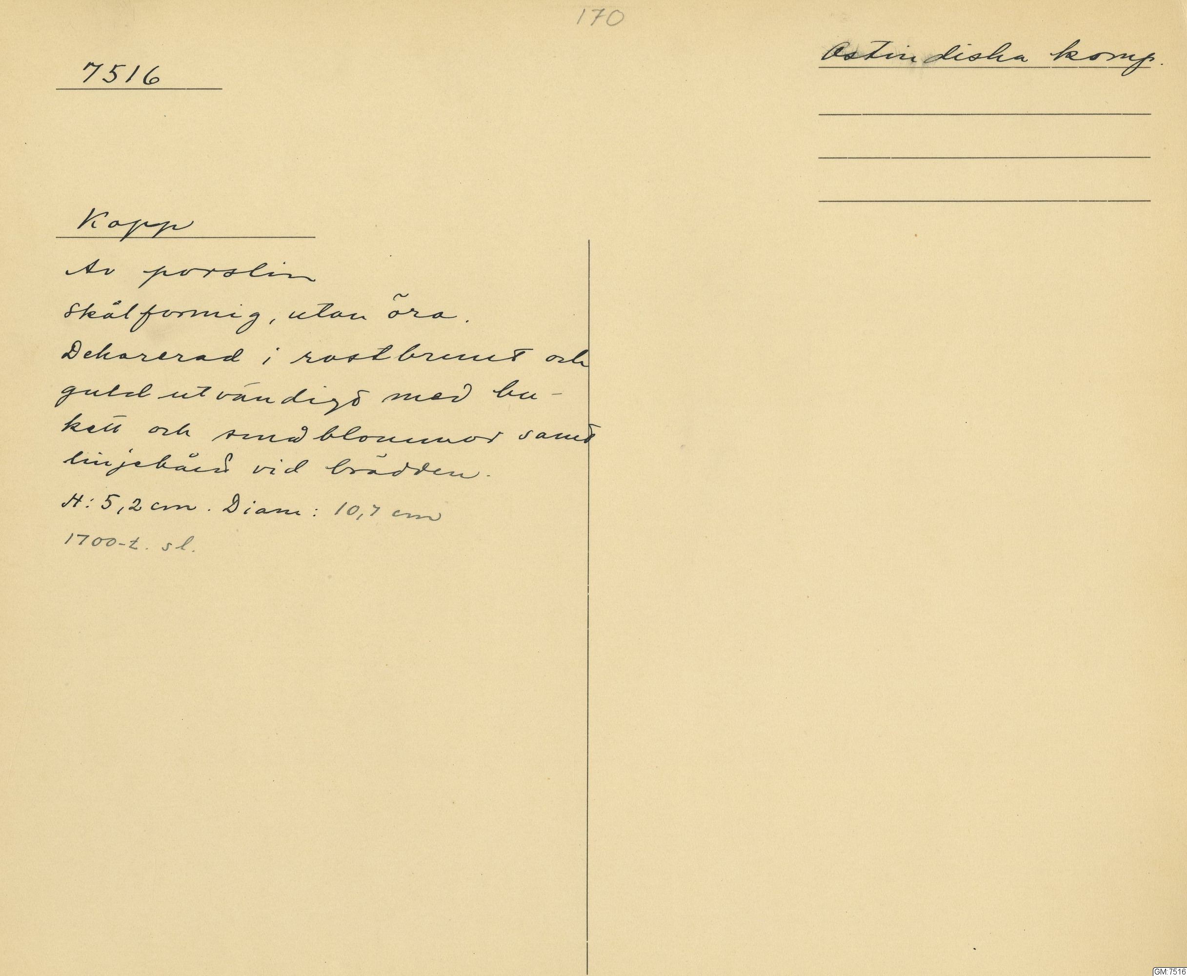 GM katalogkort 170. 18E. Porslin Ostindiskt 1. Thé mm 1. Kannor, koppar, fat