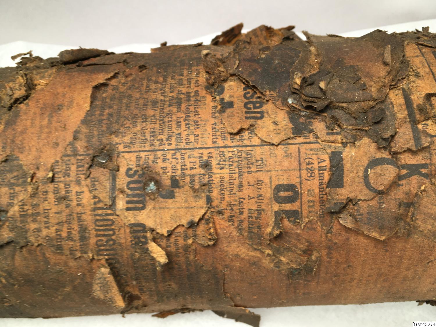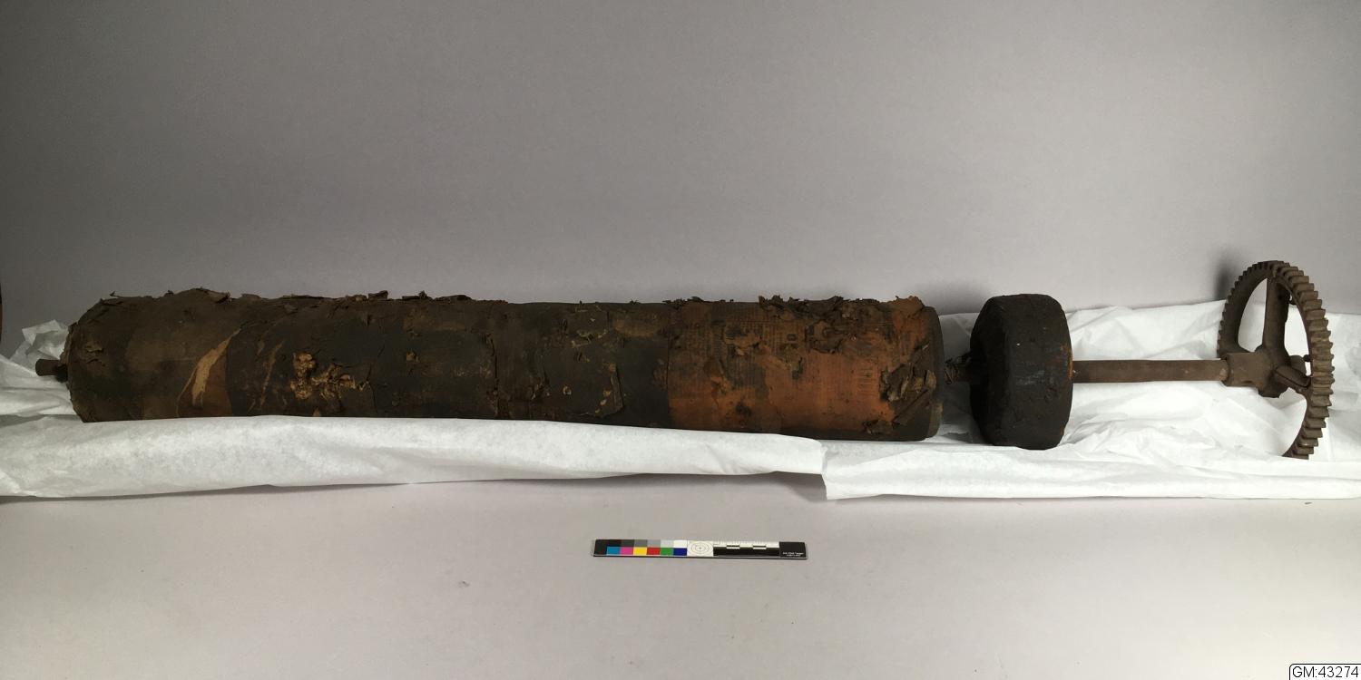 - Möjligtvis del av en vridmaskin eller läderpress, ett garveriredskap ämnat att pressa ur fukt ur berett skinn. En rulle av trä klädd i papp och tidningspapper. Ett av tidningspappren med vilken rullen klätts är Malmötidningen 1896-01-24. På ena änden ett kugghjul. Jfr H:1835 - del till?