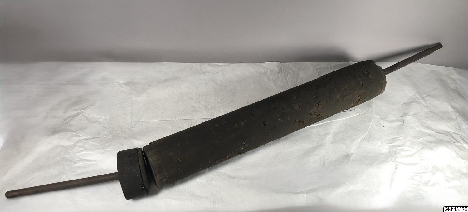 Möjligtvis del av en vridmaskin eller läderpress, ett garveriredskap ämnat att pressa ur fukt ur berett skinn. En rulle av trä klädd i papp och tidningspapper. Ett av tidningspappren med vilken rullen klätts är Malmötidningen 1896-01-24. På ena änden ett kugghjul. Jfr H:1835 - del till?