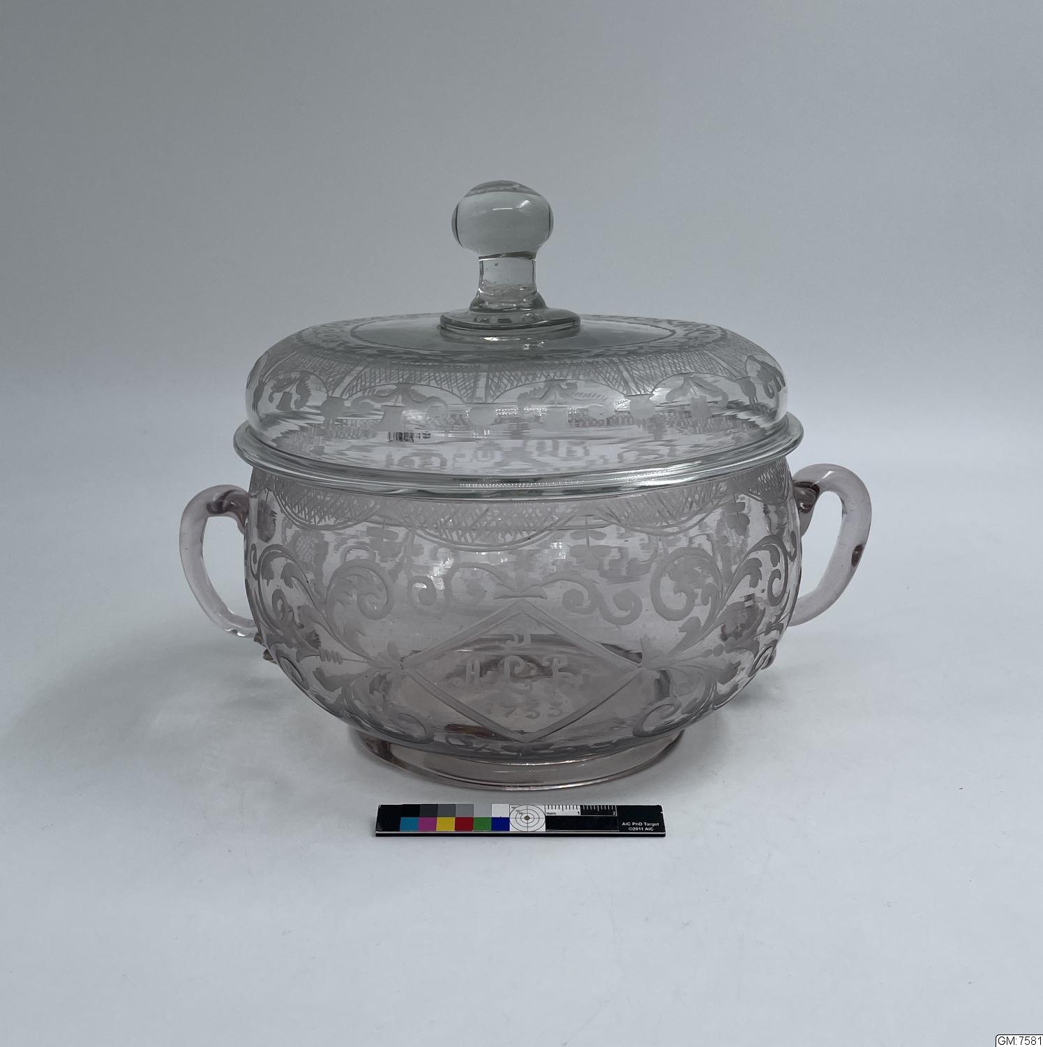 Godset lätt framåblåsigt och svagt bruntonat. Graverad dekor med lörrek och sombern med å ena sidan bokstäverna A.L.B 1733 och andra A.B. Runt locket ornament i liknande stil.