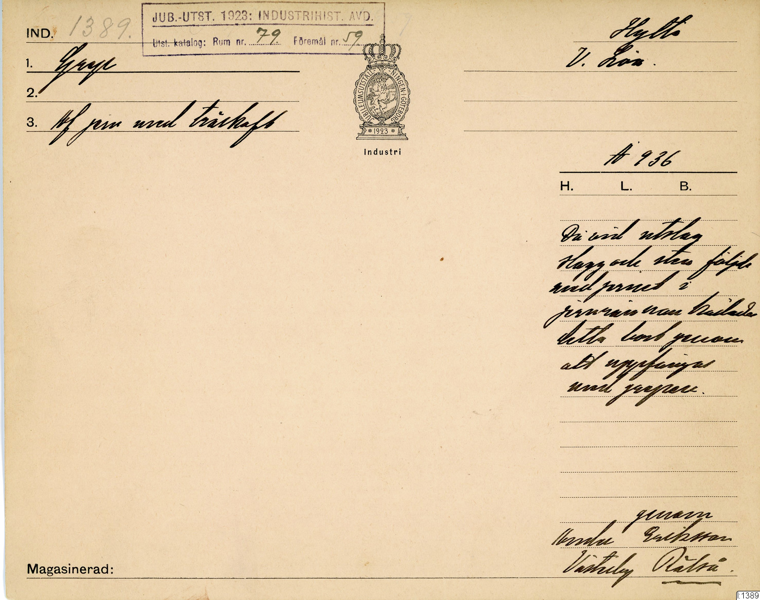 Industrihistoriska avdelningen, Jubileumsutställningen, 1923 [Rum 79, nr 59]