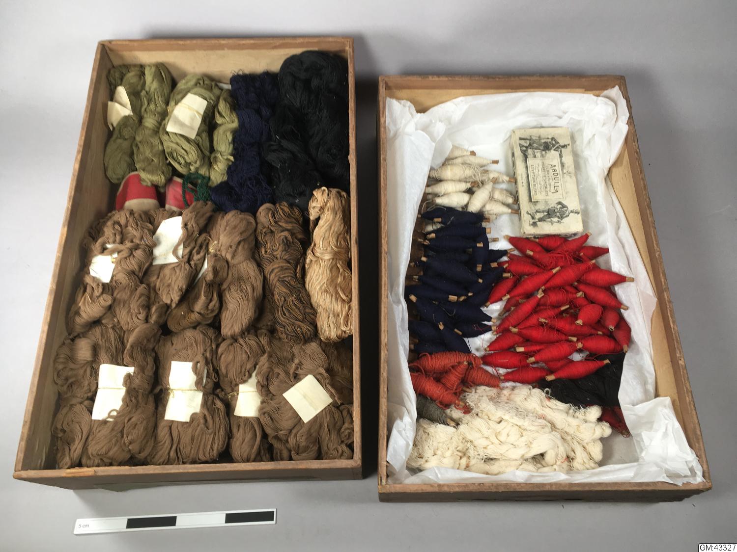 snörmakeri; Omärkt låda med omärkt innehåll bestående av garner. Från snörmakeriverkstad - sannolikt Axel Olssons snörmakeriverkstad.
