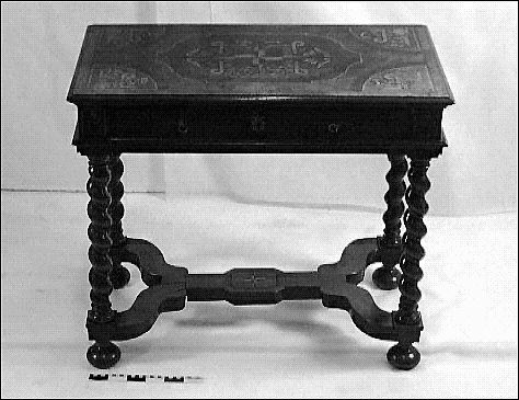 Bord av valnöt och mahogny med intarsiainlägg på skivan och sarg. Fyra spiralvridna ben sammanfogade med kryssunderrede, kulfötter. Draglåda med mässingsbeslag.