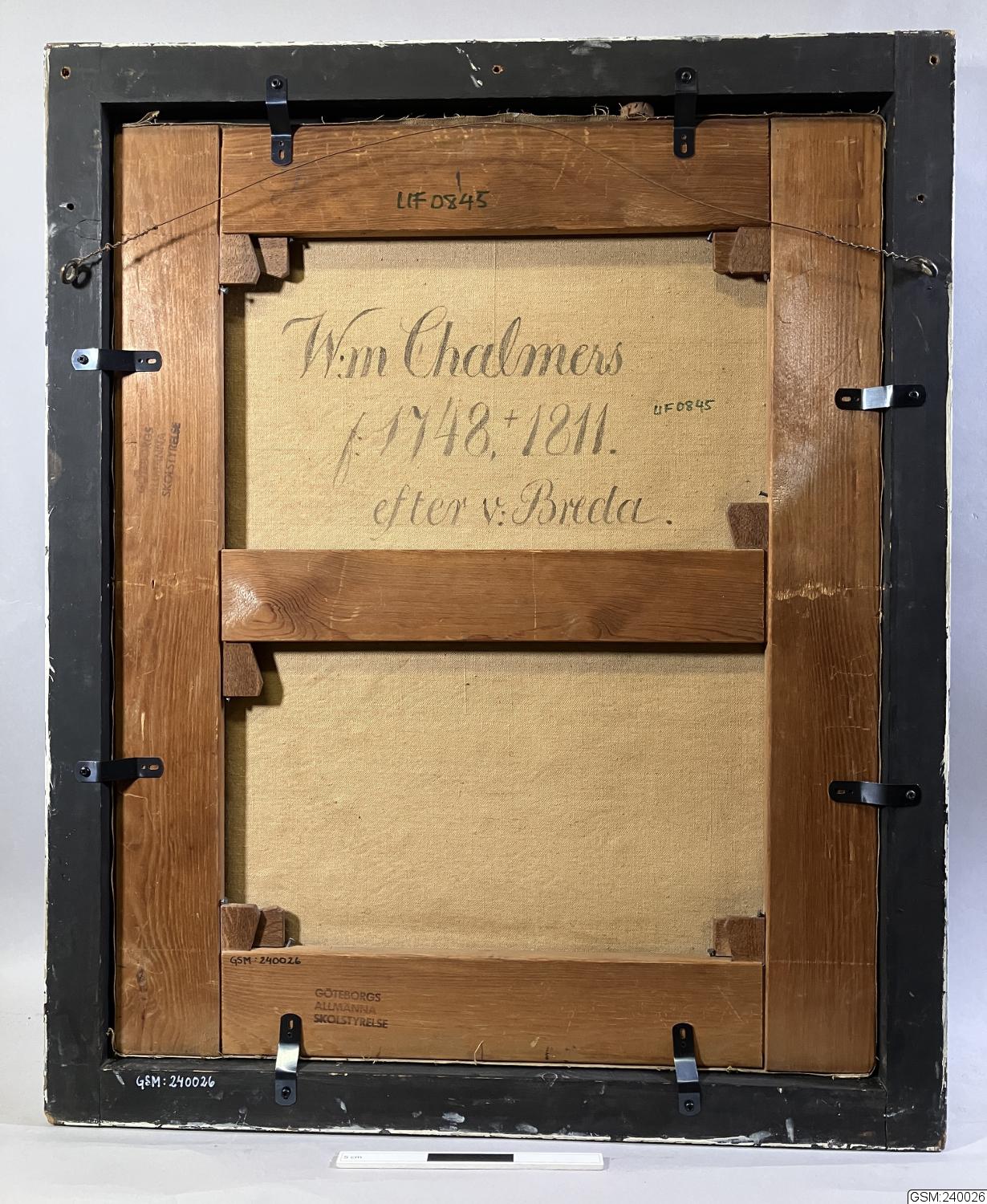 - Porträtt i olja föreställande donatorn och affärsmannen William Chalmers, målning av museiintendenten Gustaf Henrik Brusewitz, Göteborgs Museum, efter ett original av Carl Fredrik von Breda. Ramen målad och försedd med text av konstnären Brusewitz. A tergo (frånsidan av duken) försedd med målad svart text, av konstnären Brusewitz om att porträttet föreställer William Chalmers, 1748-1811, och att det är en målning efter von Bredas original./ctn.