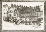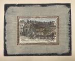 Akvarellerad blyertsteckning med Norra Larmgatan 13, huset som i folkmun gick under namnet Strykjärnet.