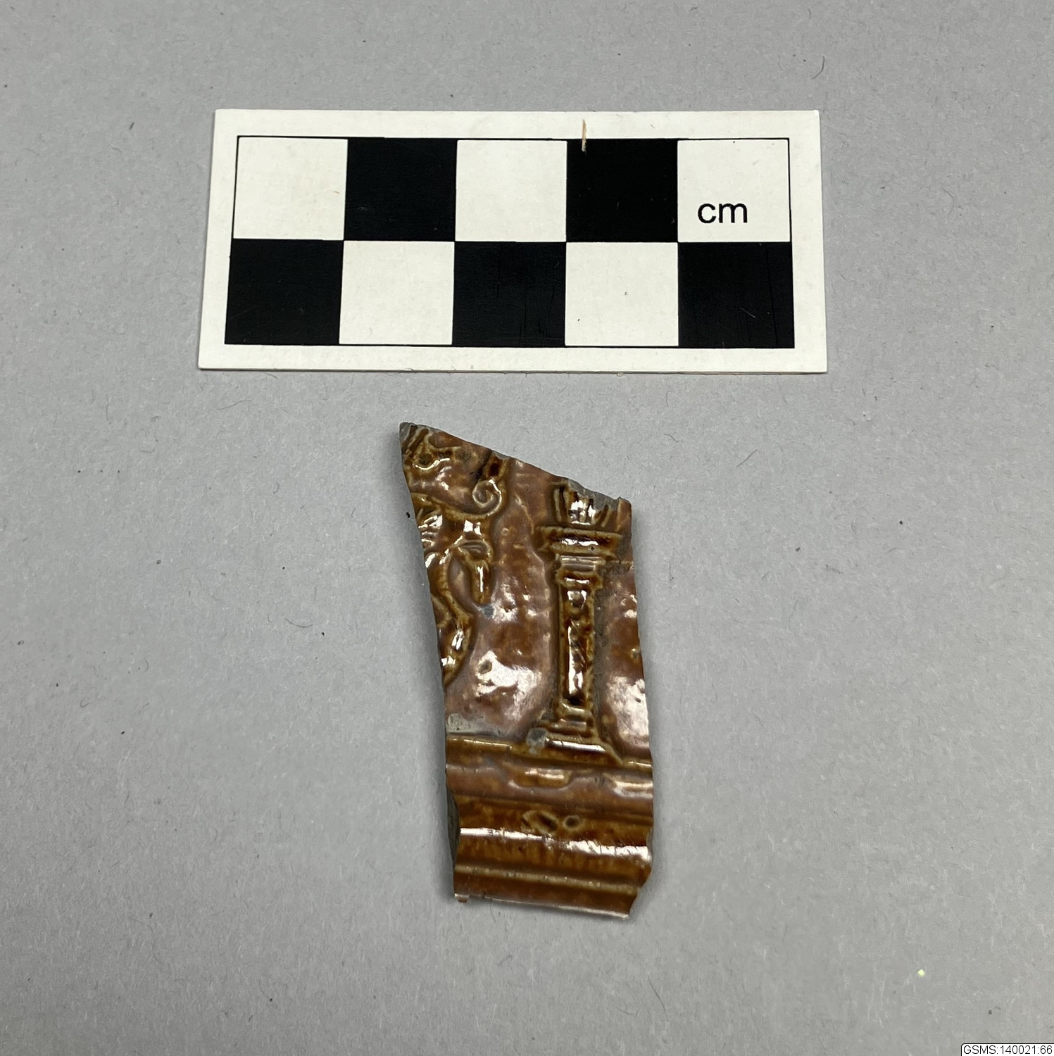 - brun skärva med byggnadsdetaljer, Raeren. Troligtvis 1600-tal.