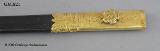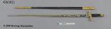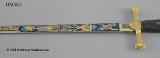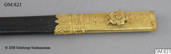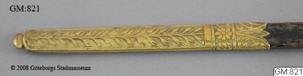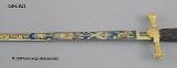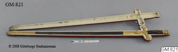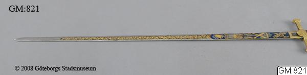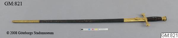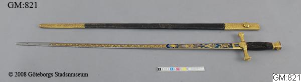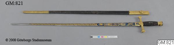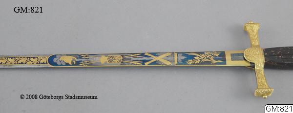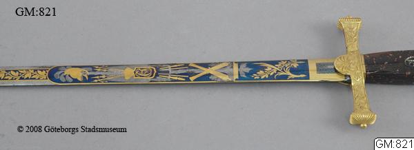 Svärd med tvåeggad klinga, blånerad och förgylld, ornamentering, rankor av lager- och eklöv, lager och palmkvistar, vapen och troféer, jämte krönta sköldar med Konung Carl XIV Johans namnchiffer samt Sveriges och norges förenade vapen. Fästet av cisilerat brännförgylld brons. Svärdsknappen är fyrkantig med infattad ametist omgiven av rosenstenar (en del saknas), kavel av porfyr med Karla XIV Johans namnschiffer i rosenstenar, (något bortfall i monogrammet.) balja av svart läder med cisilerade och förgyllda beslag.