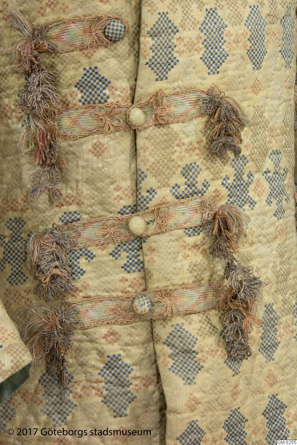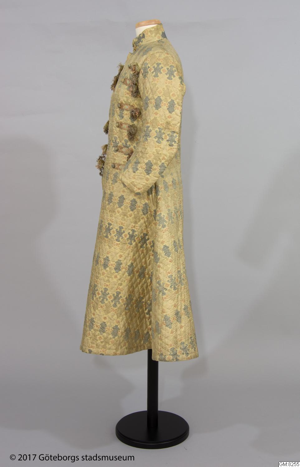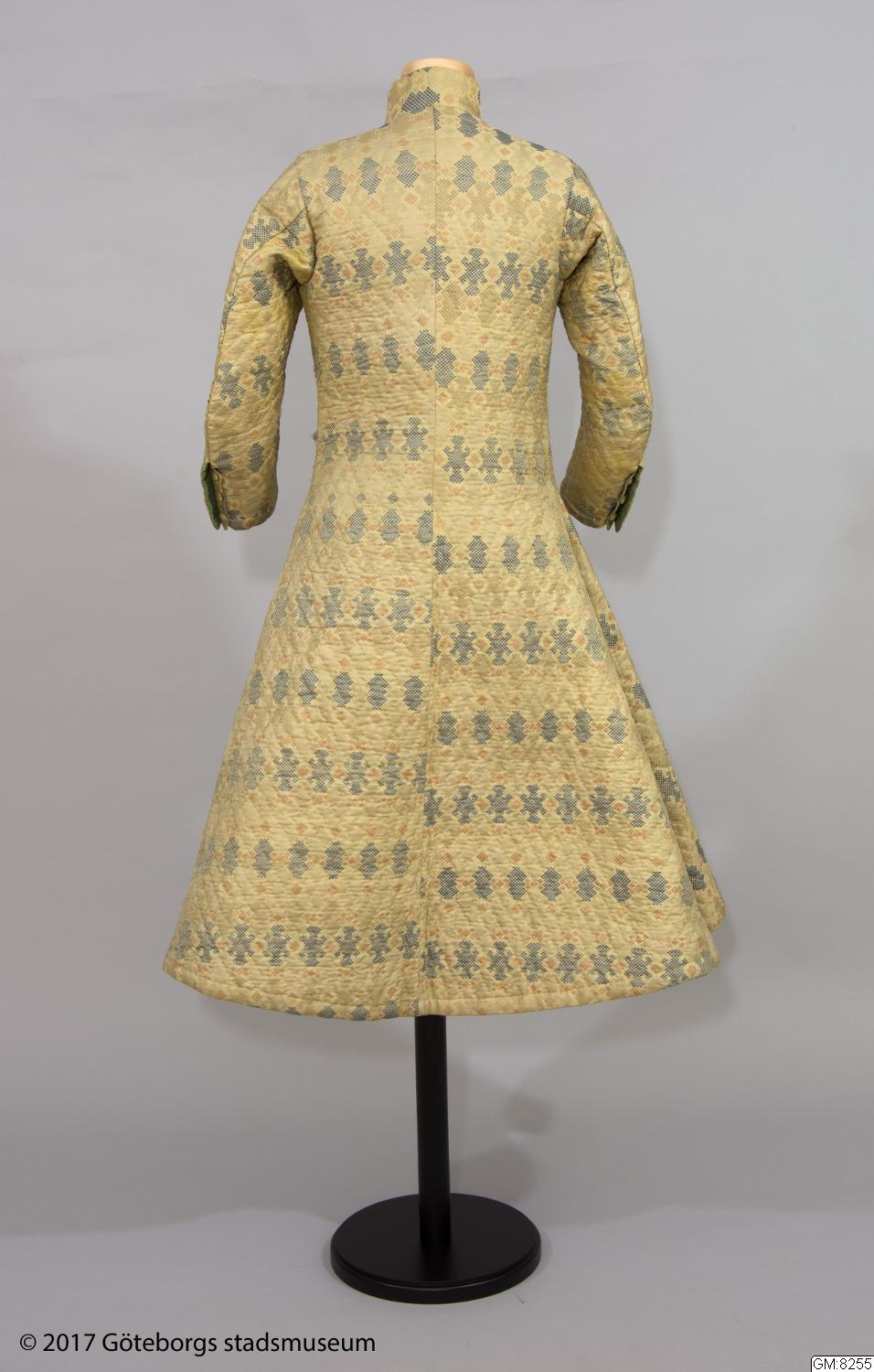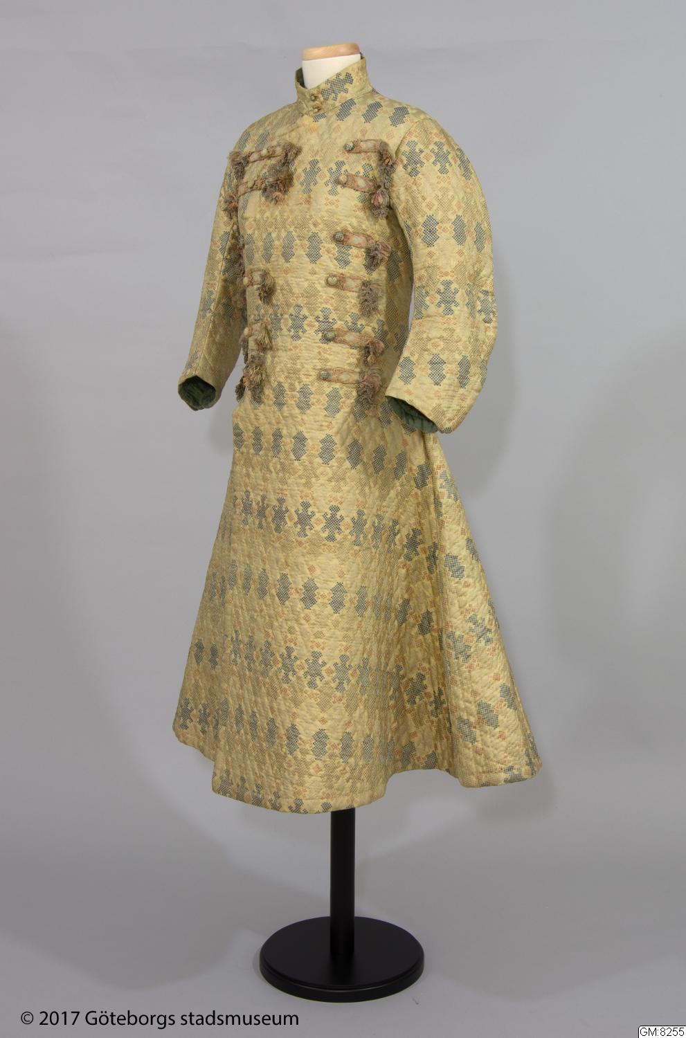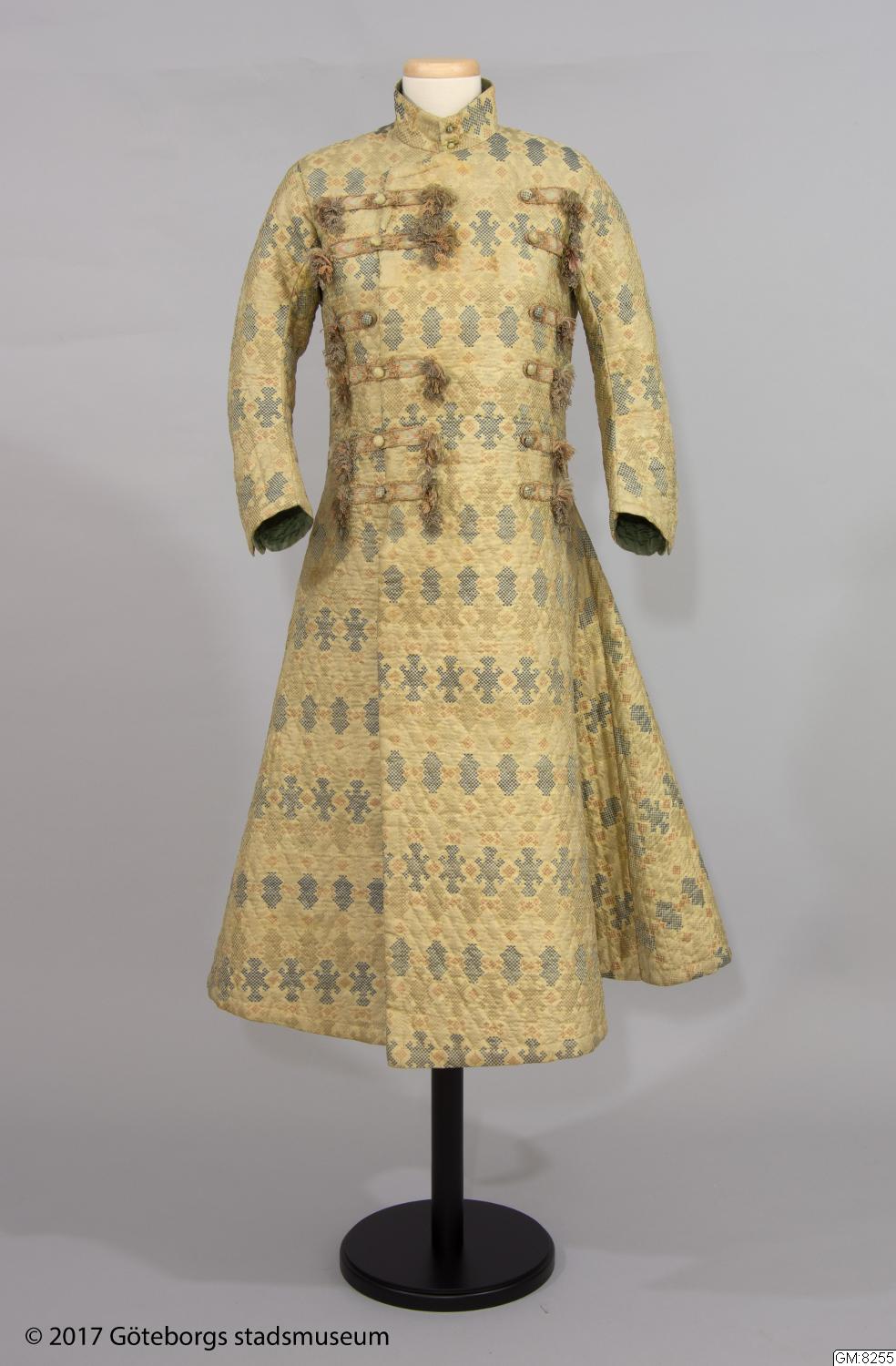 Nattrock; Siden, gult, rutigt med rutmönster i blått och vinrött. Vadderad och fodrad med grönt siden. Kupiga knappar klädda med tyget. Öppning nedanför midjan i sidsömmen t.h. Ståndarkrage, fodrad som rocken, sammanhålles framtill av små kupiga knappar och knapphål. Rocken, som kan knäppas t.h. eller t.v. är försedd med dubbla knapprader på silkessnörmakerier i rockens färg och med öglor för knapparna. Ärmar av två stycken, vadderade och fodrade som rocken. Nedtill uppslitsade och där knäppta med knappar och knapphål, som döljs av flik av tyget.
