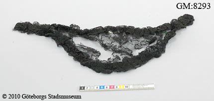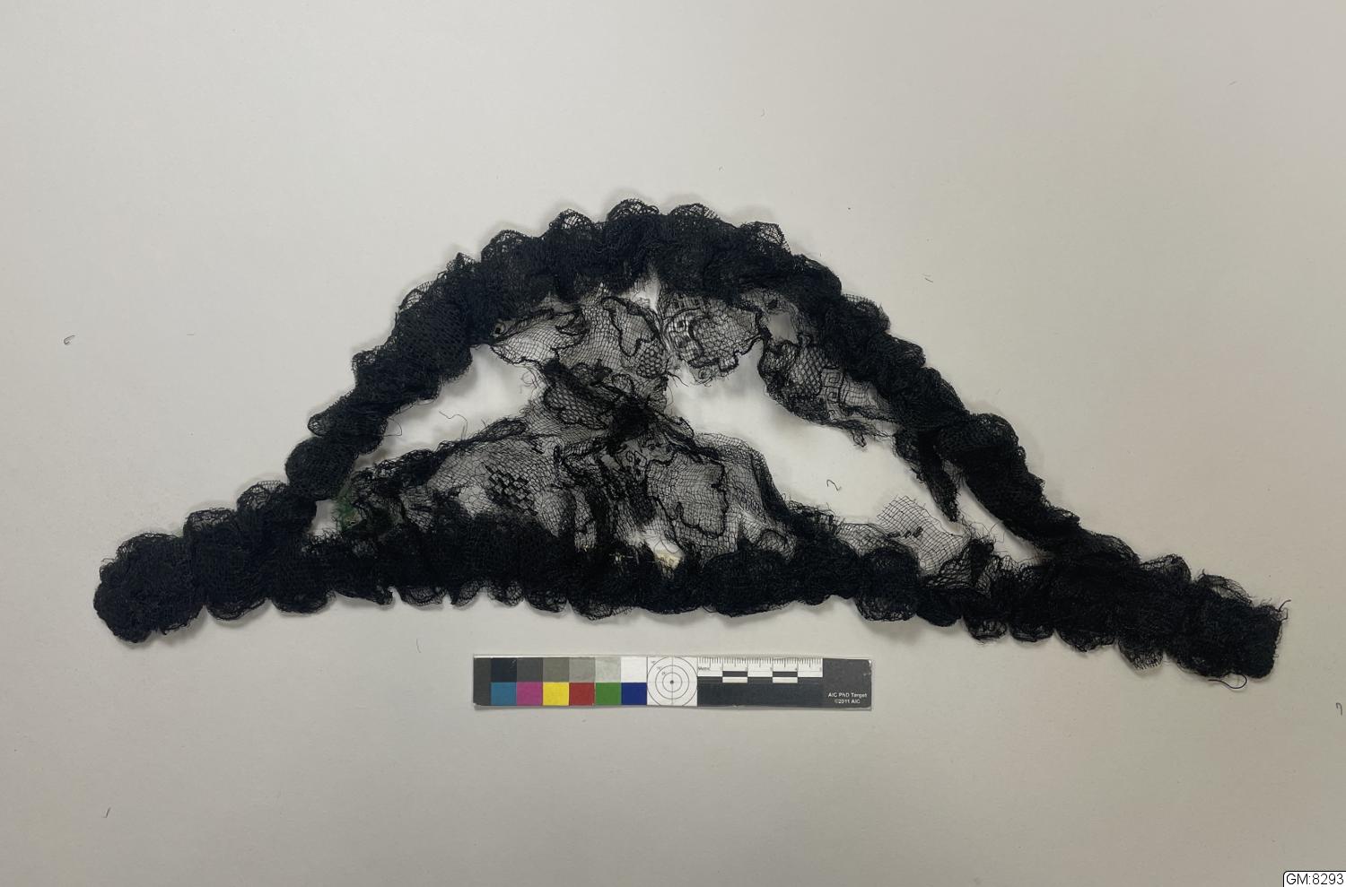 - Svart sorghatt i tyll med dekorativt band runt kullen. Tyllen är prydd med broderier. //Linda Zetterberg, konservatorpraktikant 031110