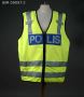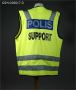 Gul reflekterande väst med ordet polis i blått på fram- och baksida. Ordet support i svart på baksidan. Reflexband påsydda på runt om.
