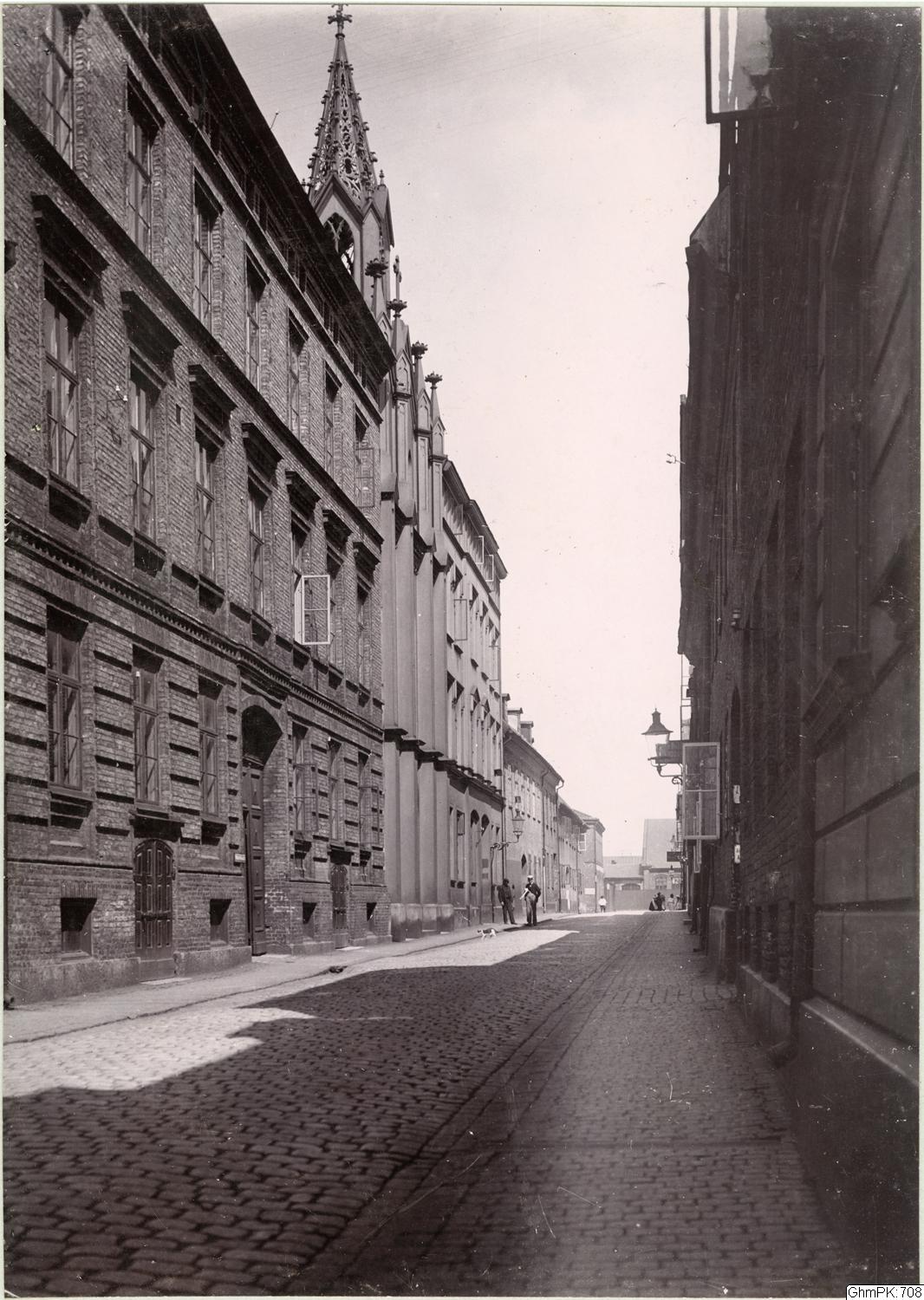 Sträcvkningsbild med Spannmålsgatan mot öster. Mitt ibild syns fasad och torn till St Josefs kyrka, Göteborgs första katolska kyrka från 1868.