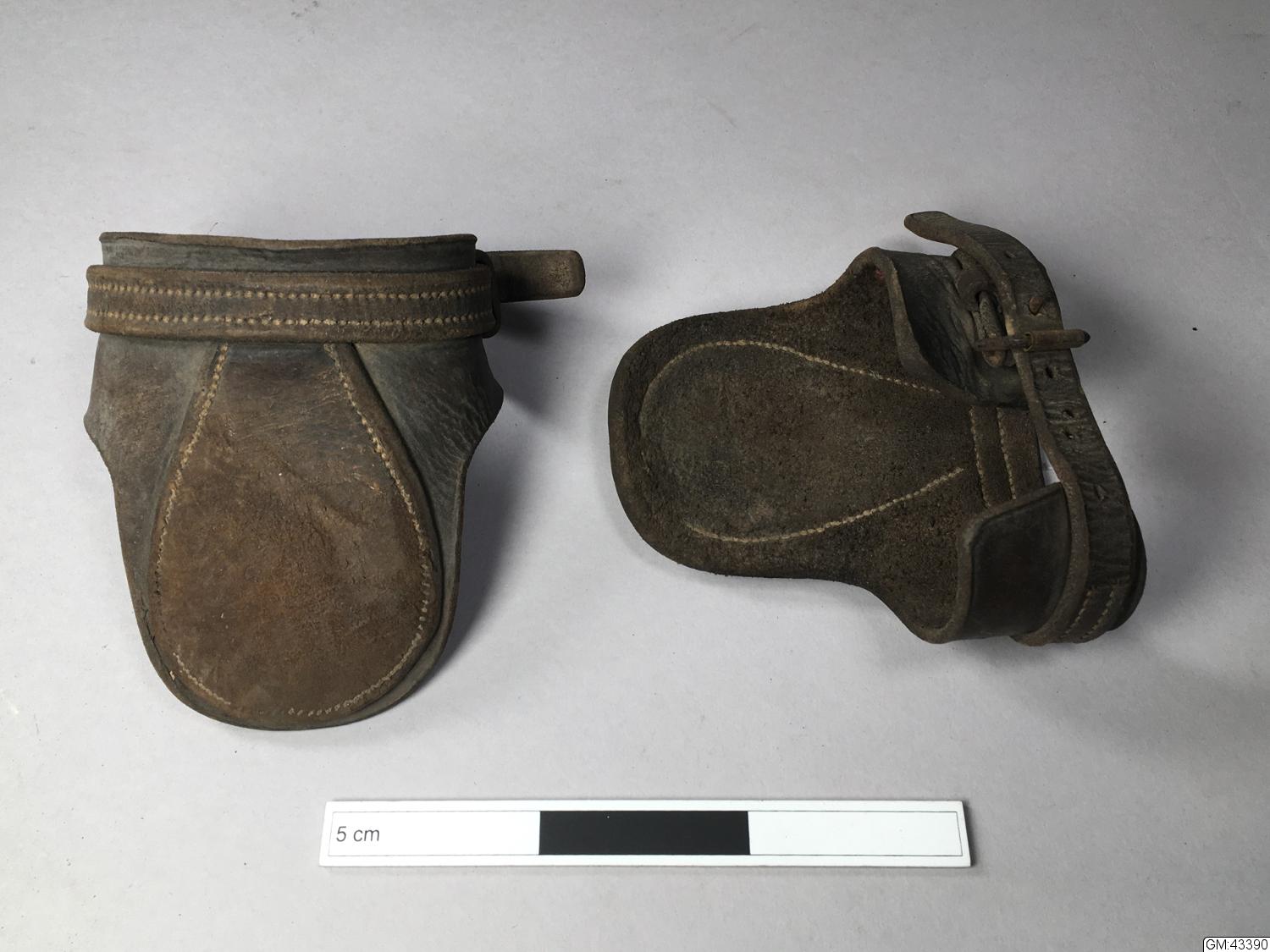 skydd av tjockt läder med spänne. Hittade omärkta i magasin. Hör till oidentifierat hantverk. Möjligen gelbgjuteri eller kopparslageri