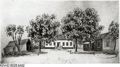 teckning; bondgård; mangårdsbyggnad; bostadshus; uthus; gårdsplan; träd; exteriör; dag; vår; sommar; höst