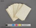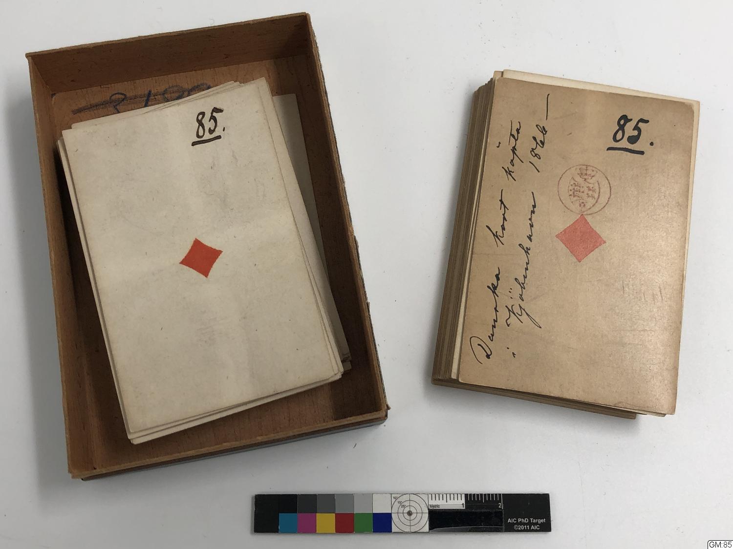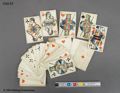 Vanlig kortlek. Ruter ess försett med stämpel och handskriven text: "Danska kort köpta i Kjöbenhavn 1866". Baksidor med slingmönster i ljusblå prickar. Guldsnitt. 101 st. kort totalt.