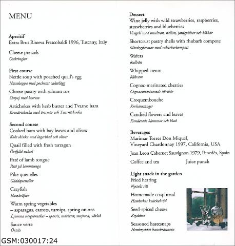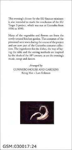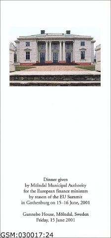 menu från middagen 15 juni 2001 på Gunnebo Slott