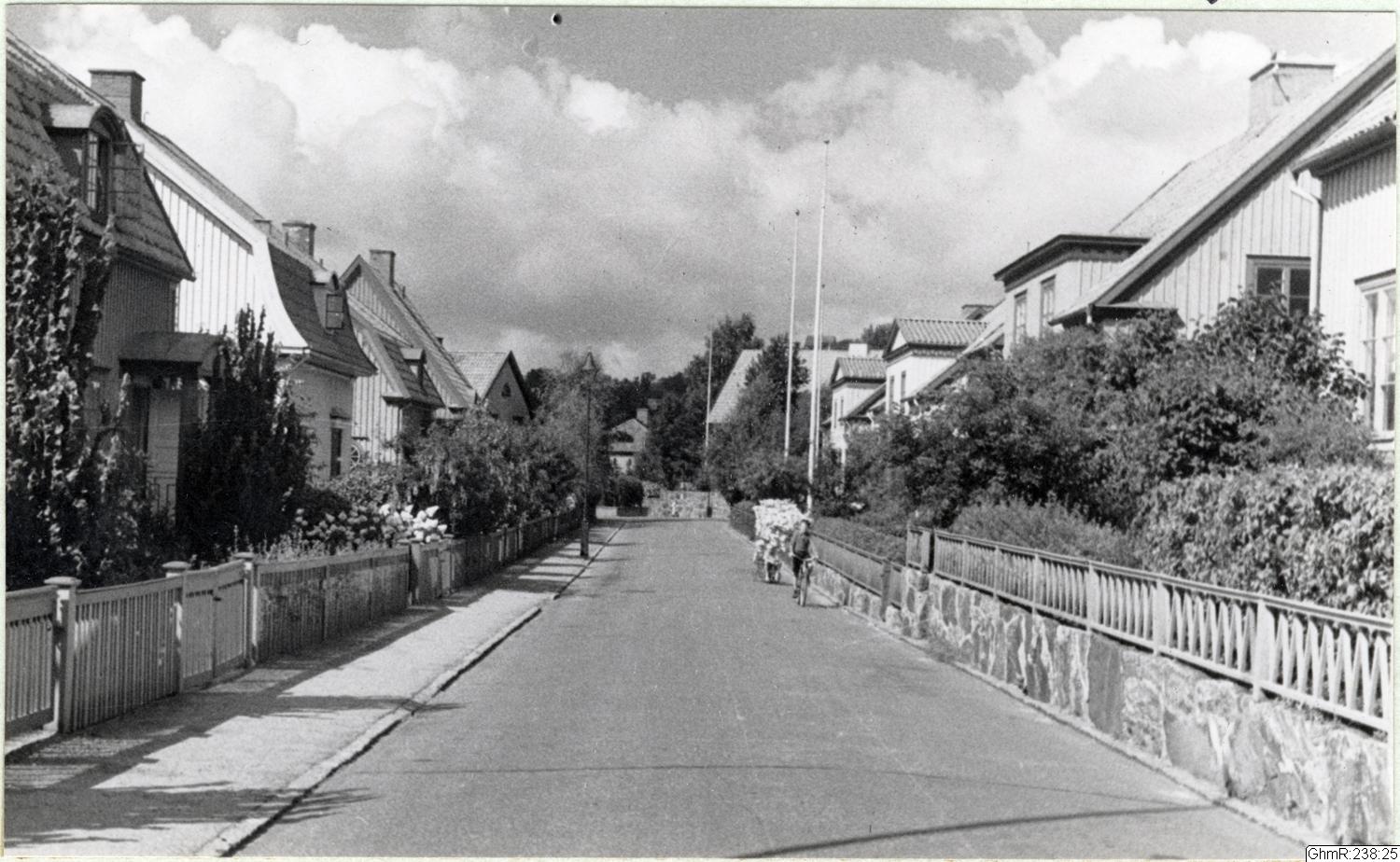 bostadsområde; bostadshus; trädgård; träd; buske; staket; grind; flaggstång; cyklist; exteriör; vår; sommar