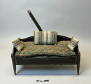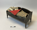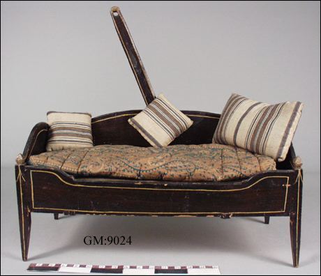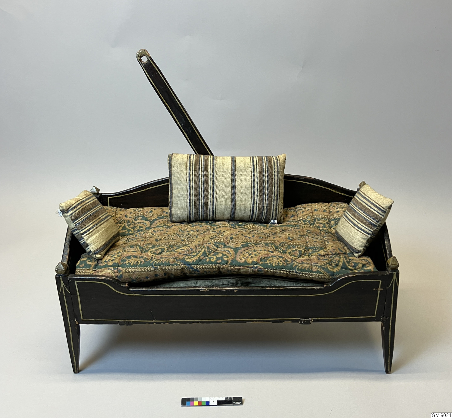 - Docksäng med madrass, kuddar och täcke. Docksängen är en bäddsoffa.