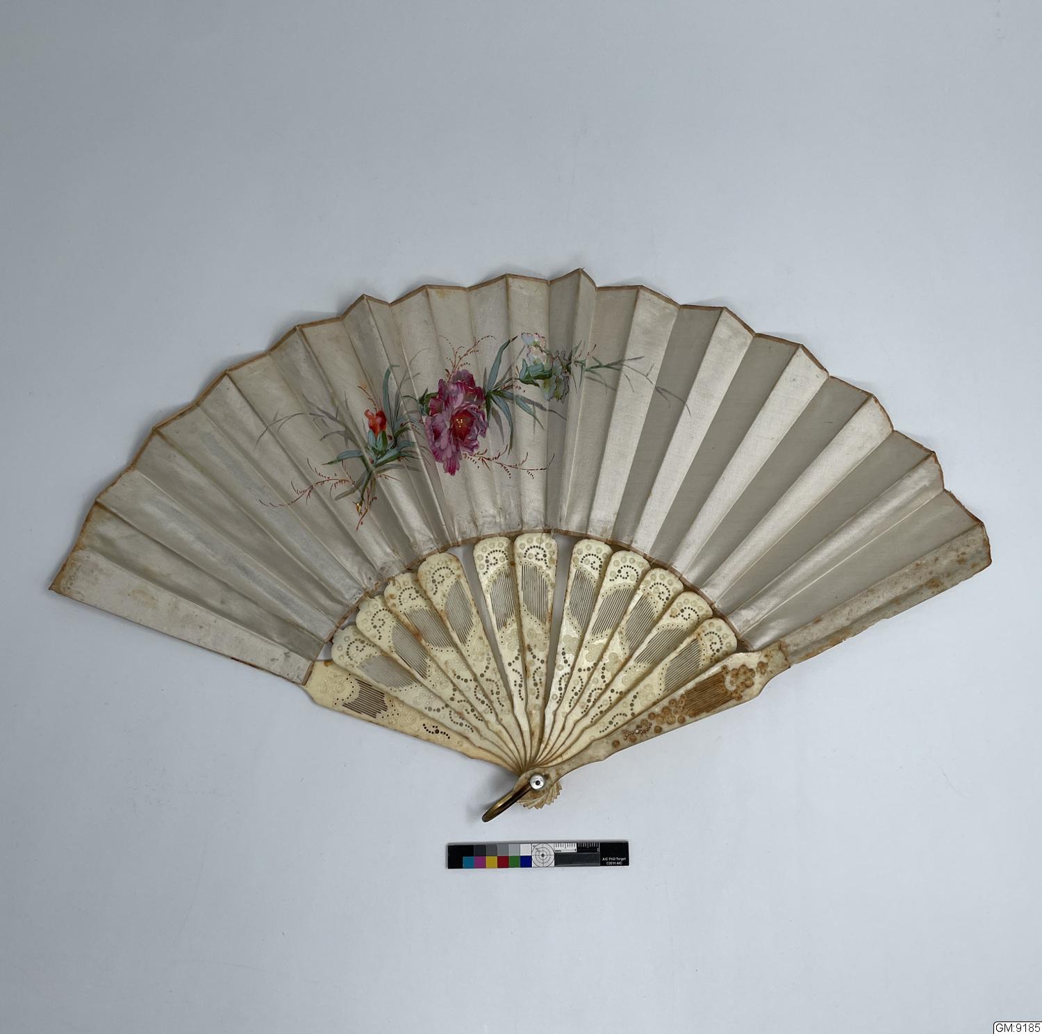 Solfjäder, siden med målat blomstermönster.