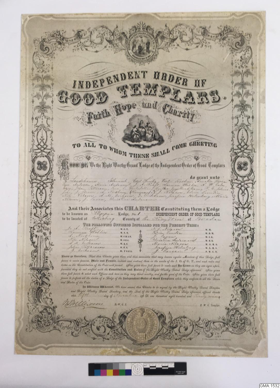 Instiftelsecharter utställt å Sveriges första Goodtemplarloge nr 1 Klippan.