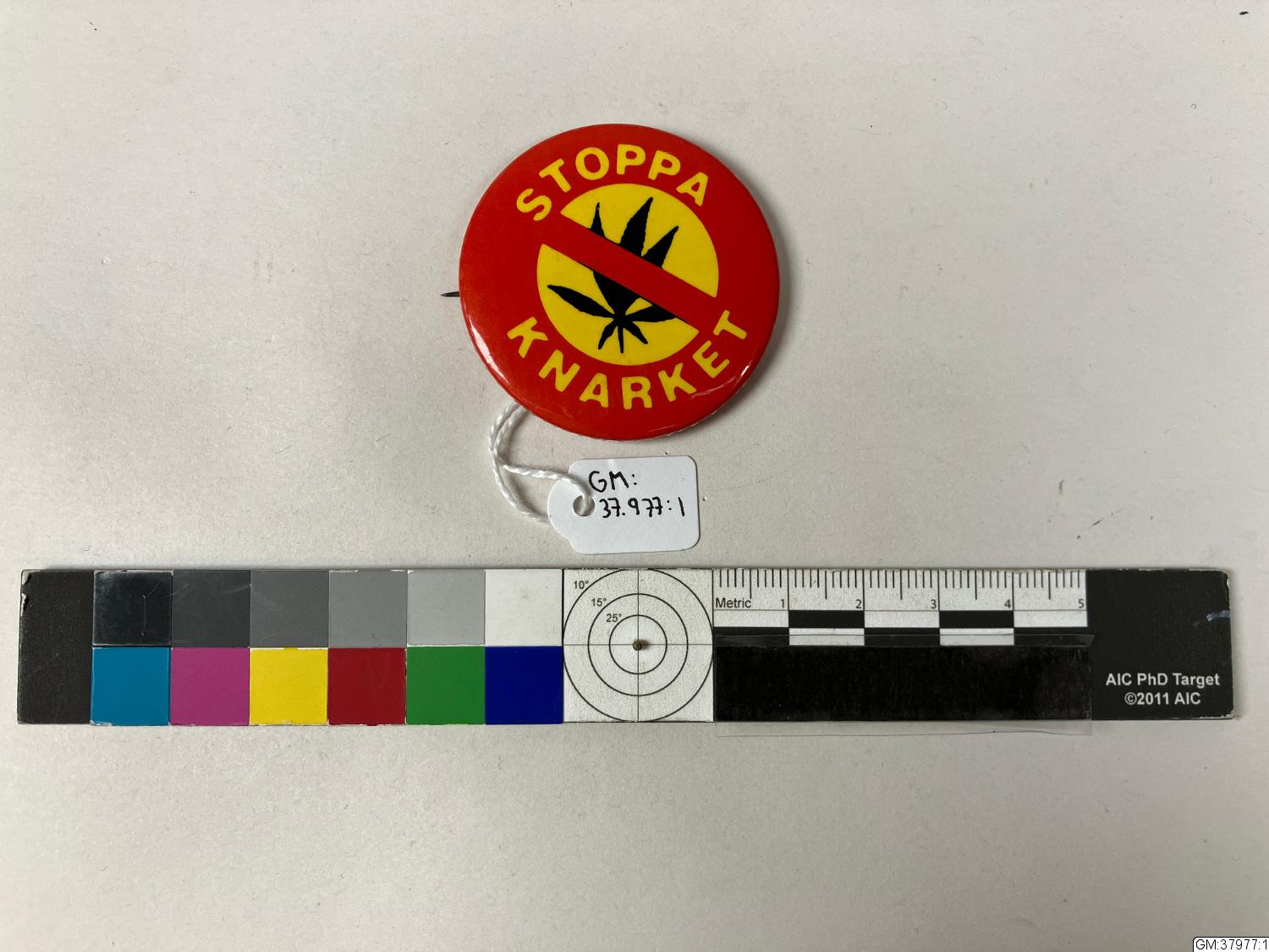 Ett runt märke rött med gul text "Stoppa Knarket"samt ett överkryssat marijuana blad