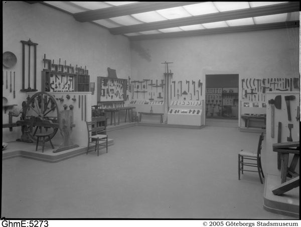 'I denna lokal finnas sammanförda verktyg och redskap hörande till de yrken, som till material använda huvudsakligen trä.' [beskrivning enligt jubileumskatalog för Hantverkshistoriska och industrihistoriska avdelningarna]