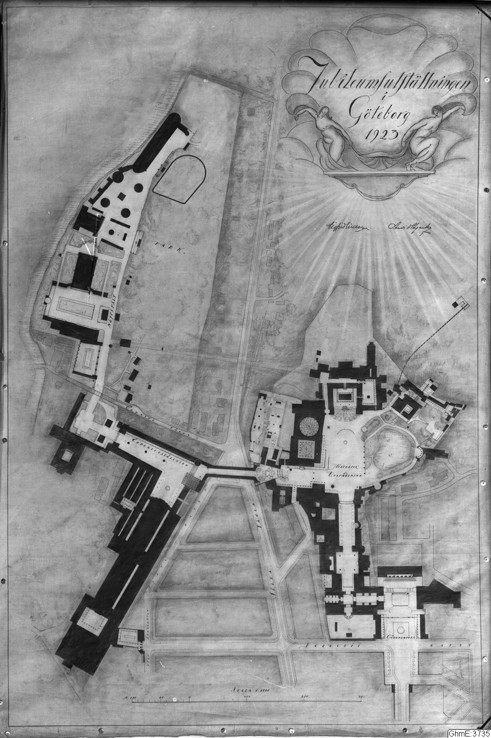 - Karta över utställningsområdet för Jubileumsutställningen 1923. Kartan utförd i nord/sydligriktning. Nedre delen visar Göta Platsen, Berzeliigatan och Exportutställningen. Norrut liggerhisotriska utställningarna. Till vänster om dessa syns parkområden och nöjlesfält.
