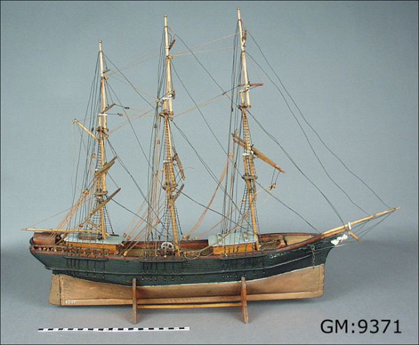 klipperbyggt fartyg med akterspegel och gallionsbild. Bronseringen i botten antyder förhydningen. Ankarspelet är summariskt utfört, tydligen ett pumpspel med taskor. Kättingarna går ned i boxarna genom däcksklysena. Livbåtarna är av cederträ, liksom lästången, religen till halvdäck och nagelbänkel vid länspumpen. Storluckan ligger mellan stormasten och skanshuset. Länspumpen med sitt hjul akter om stormasten. Kajutan är stor med ett skylight. Två dörrar på förkant direkt ut på stordäck. Roderhuset är även av ceder. Allt på däck är skrapat och oljat. Huvuddäcken grå, skrovet svart och vattenlinje, namnbräda och galjonsbild vita.