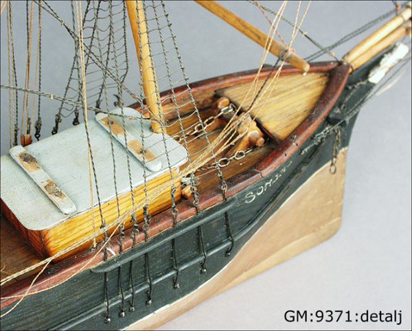 Hela stående riggen finnes och brassarna. Waterstag, gajer, stag, vant och bardun är av virad järntråd, stångriggen av segelgarn. Vevlingar av svart sytråd, fattas på puttingsvanten och bramstångsriggen. Hela royalstångriggen fattas. Toppläntorna, mesandikar och den nämnda bramstångsriggen är brunfärgad. Brass-skänklingarna, drejrep och taljrep är svarta. Brassarna och fallen till rårna vita. Jungfrur saknas. Samtliga rår brassas akterifrån utom kryssbommen och kryssroyaln. Underrårnas brassar gå direkt till lästången, överrårrnas från salningarna på den andra masten i däck, första bordvarts. Mesanbommen har dubbla skot. Statgafffelns skänklingar är fästa i kryssmasten. Rackerna är gjorda de undre , fasta, av ståltråd, de övre av tunt bläck. Märs och bramsalingar är gjorda av cederträ. Easelhuvud och racker är vitmålade, kaltopp och knapparna är förgyllda. För övrigt är allting skrapat och oljat tills värders. Blocken av trä.