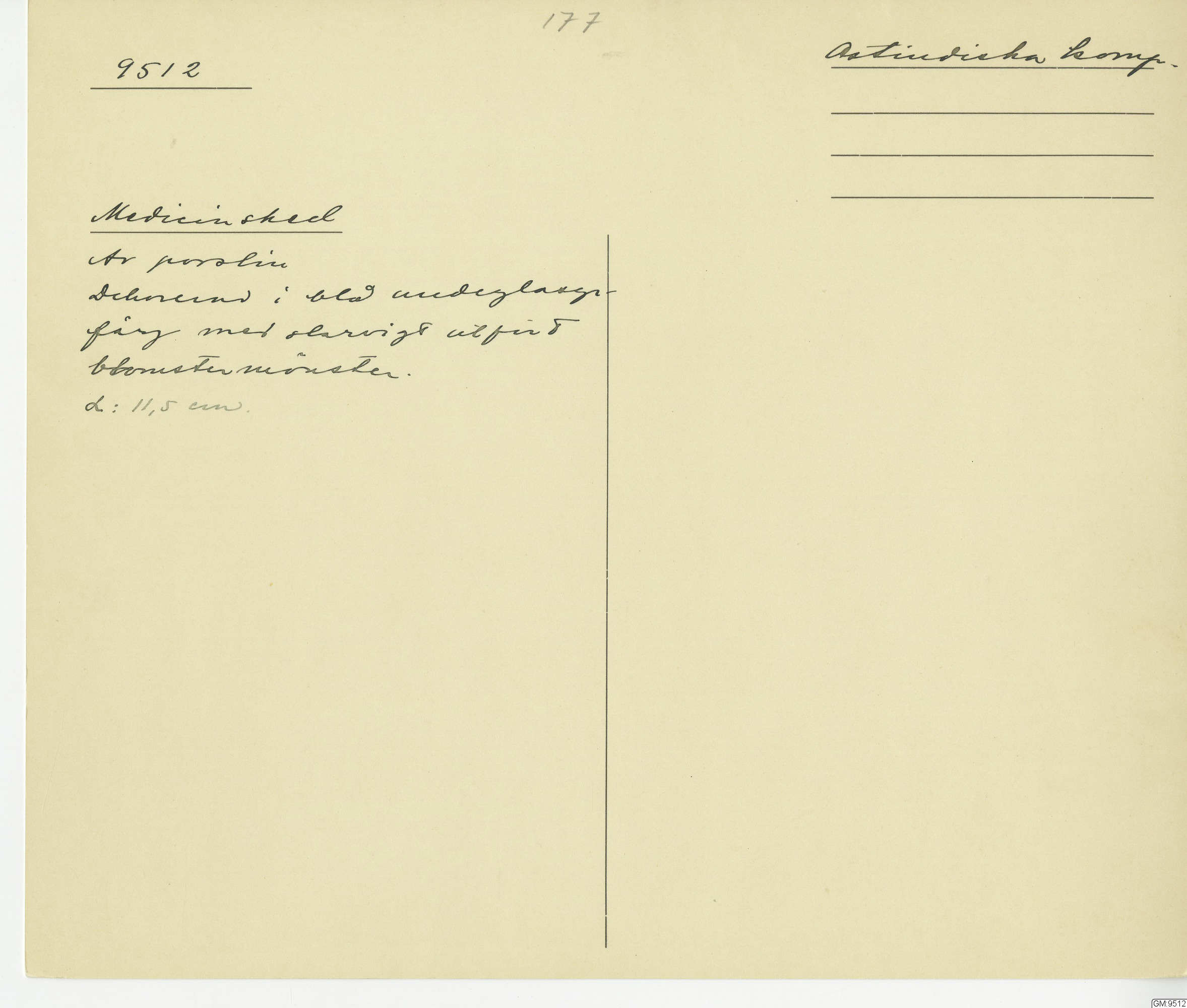 GM katalogkort 177. 18E Porslin Ostindiskt 7. Krämkopp, bidé, nattkärl, askar mm