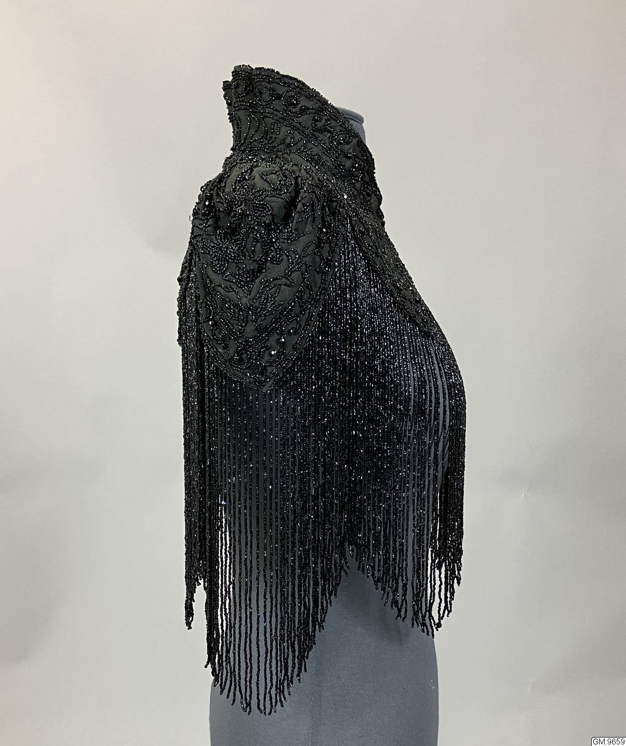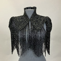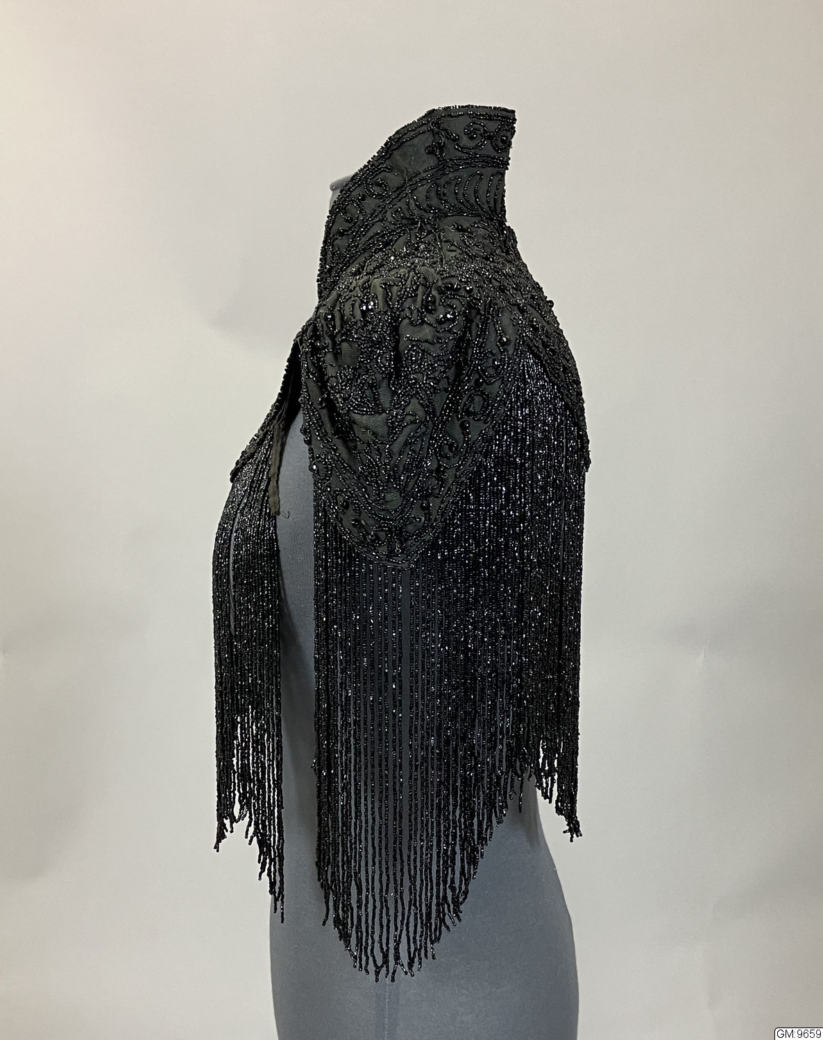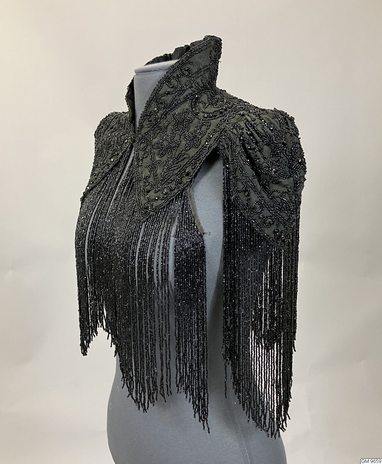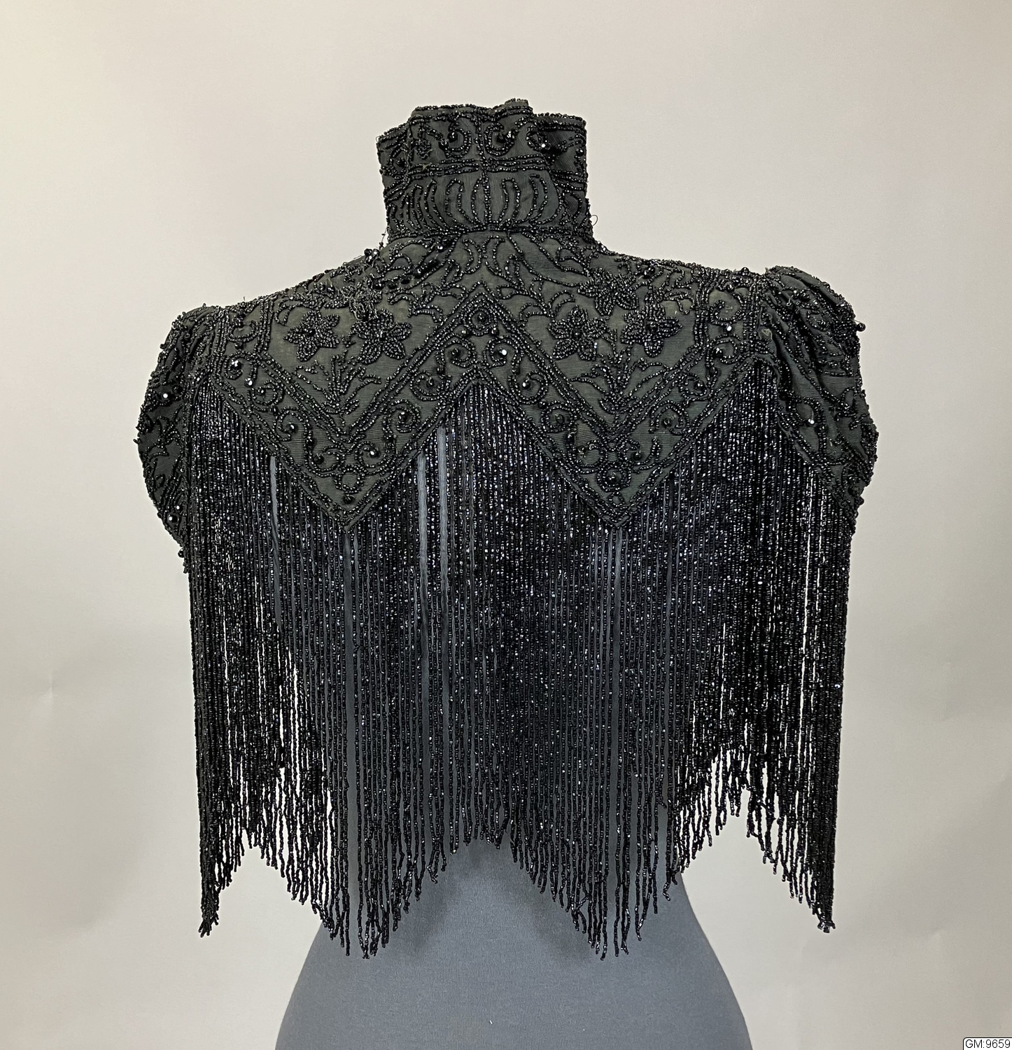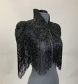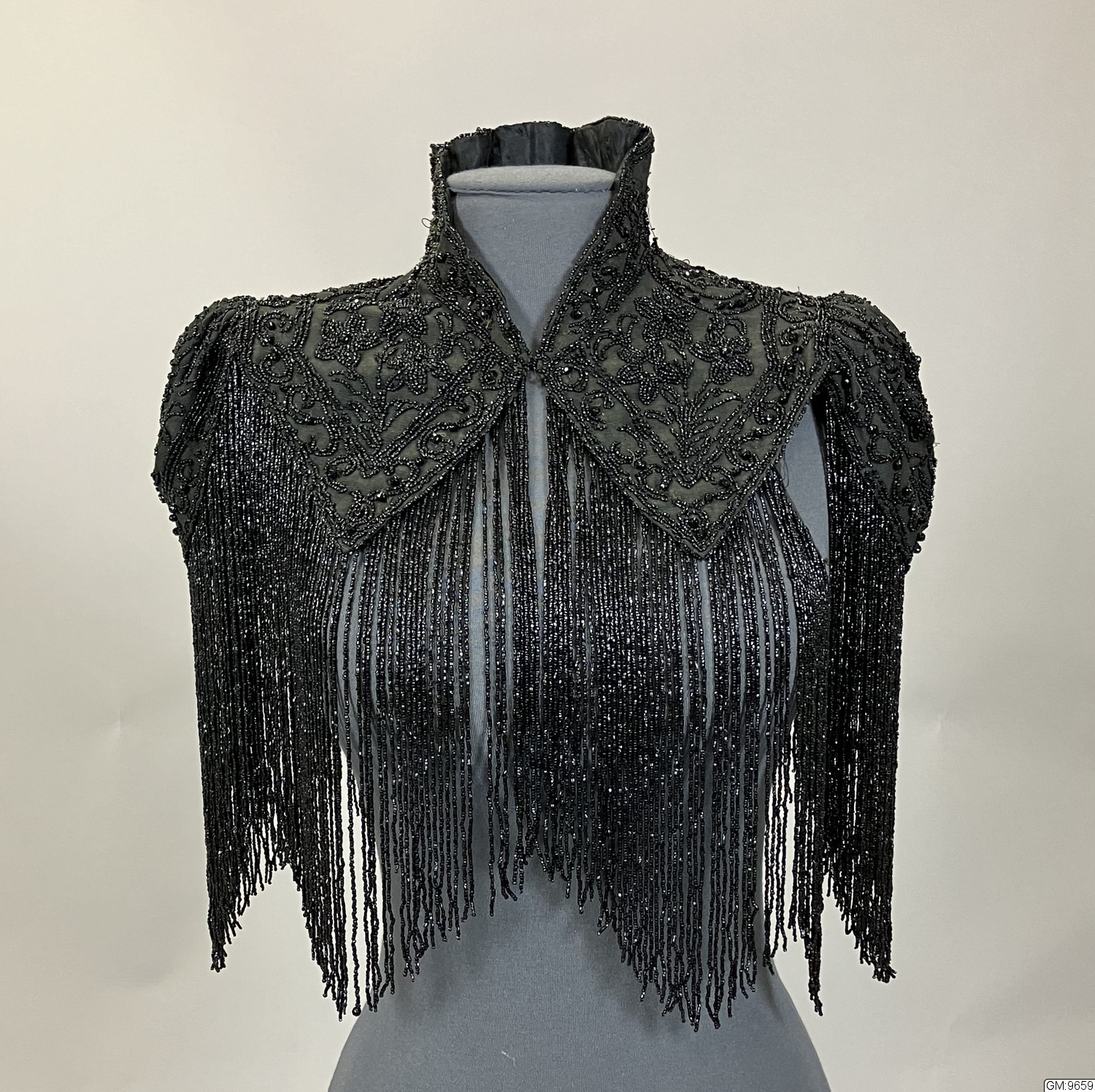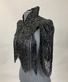 Svart pärlbroderad krage i sidenrips med hög krage och lång pärlfrans som går runt hela nederkanten. Fodrad med siden, knäppning med hyska och haje i halsen.