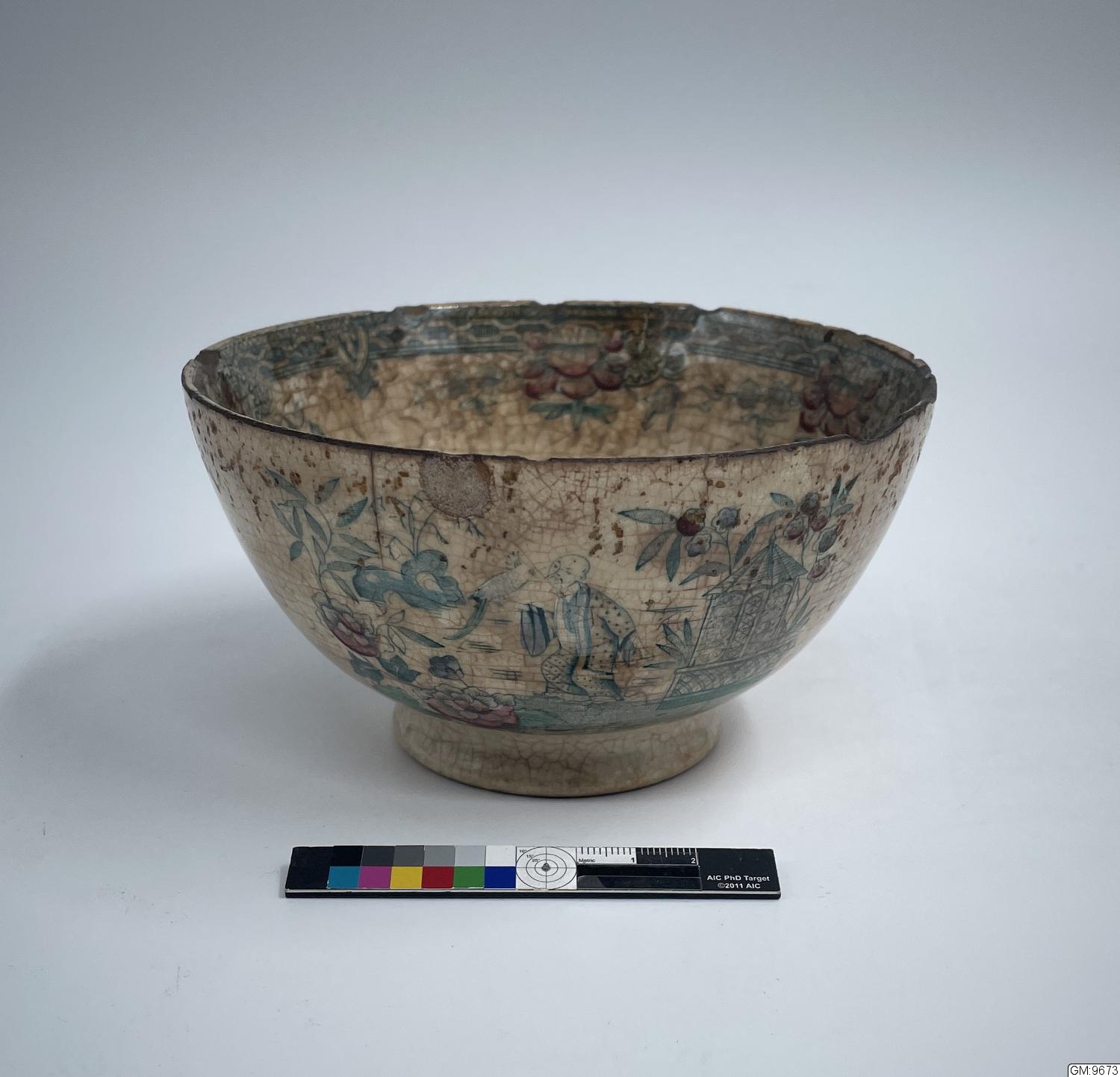 Spilkum av glaserat lergods med kinesiska motiv i grönt, brunt och rött. Konstgjord krakelering.