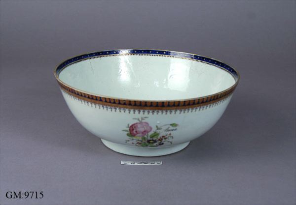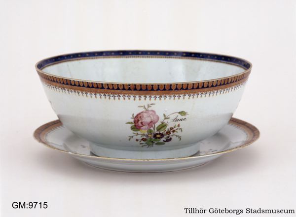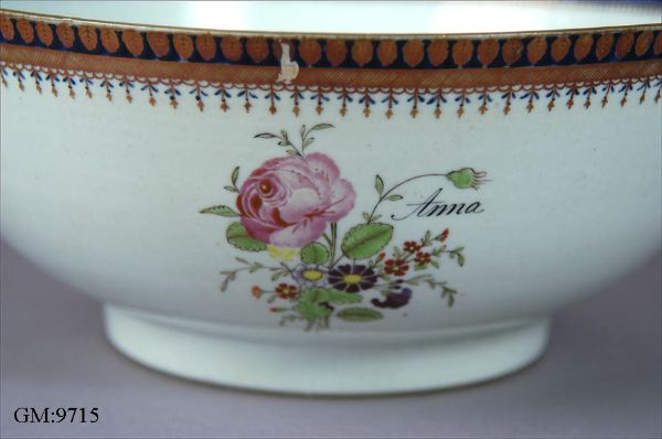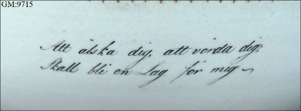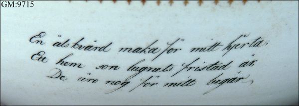 Anna [inskription i skrivstil på skålens sida]; Att älska dig, att vörda dig; Skall bli en lag för mig [inskription i skrivstil på skålens sida]; En älskvärd maka för mitt hjärta; Ett hem [som] lugnets fristad är, De äro nog för mitt begär [inskription i skrivstil på skålens sida]
