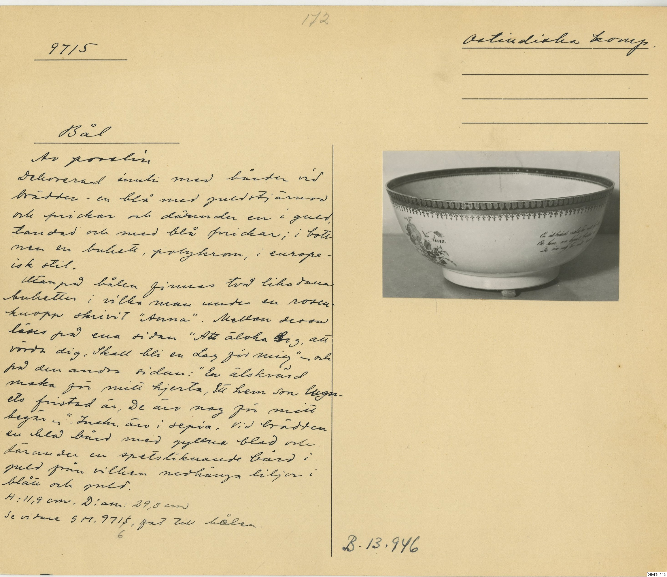 GM katalogkort 172. 18E. Porslin Ostindiskt 2. Fat, assietter, bålar