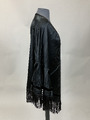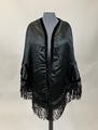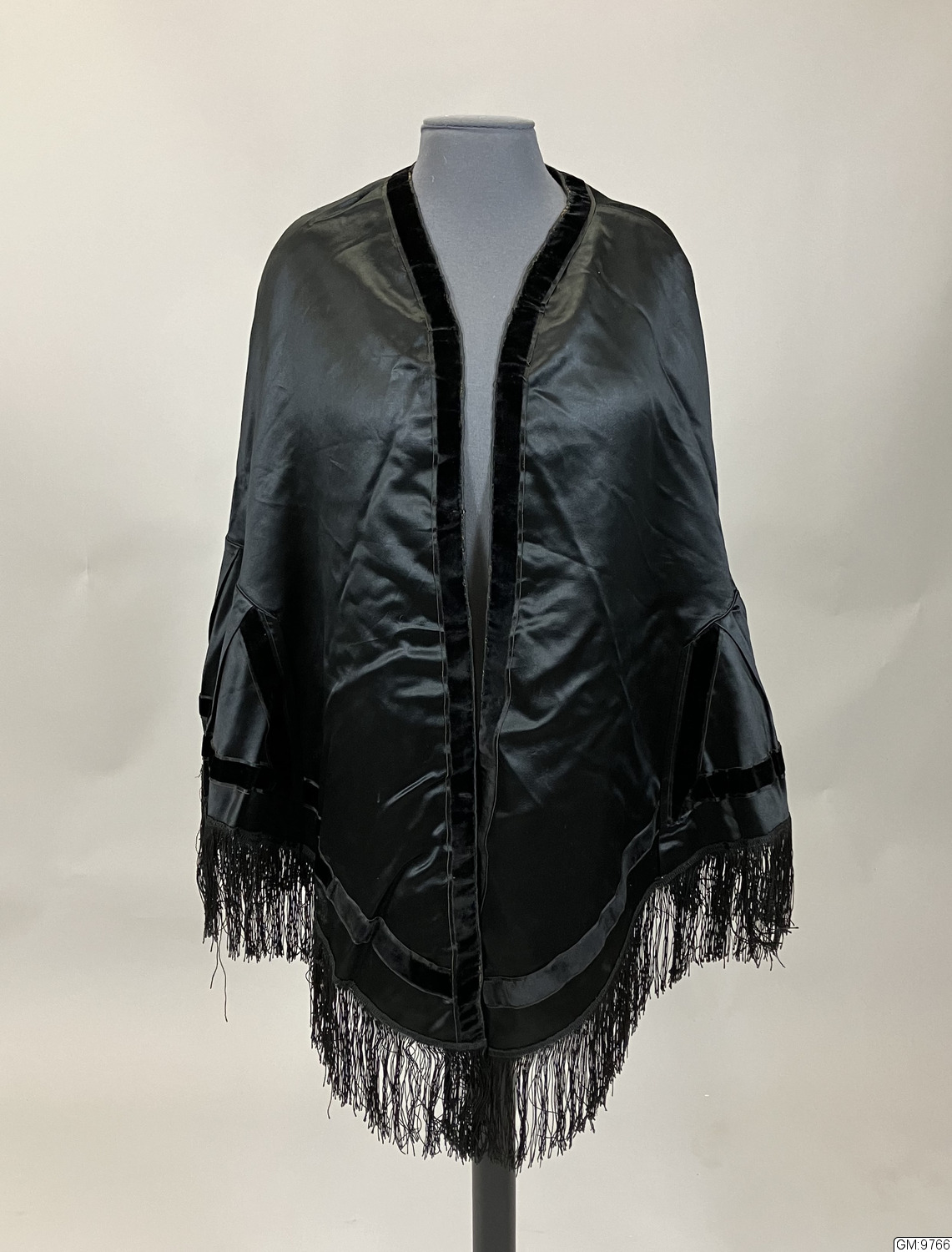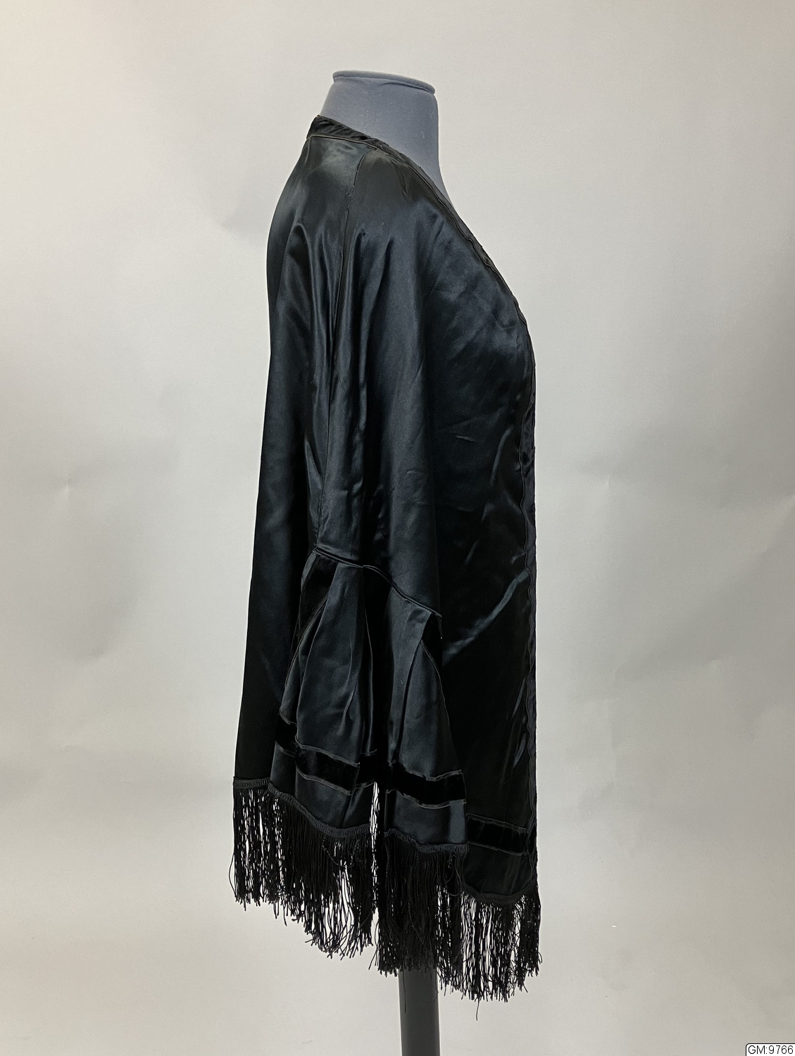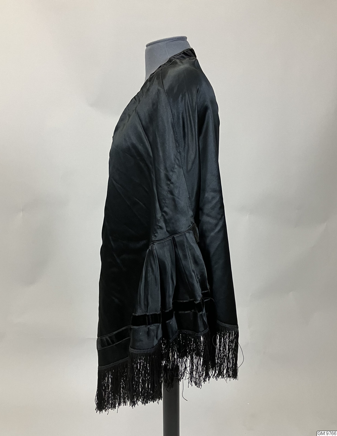 ape/mantilj av svart siden med dekorationsband av svart sammet och kantad med silkesfrans.