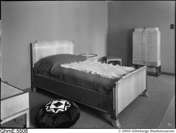 utställning; bostadsinteriör; sovrum; säng; bord; pall; skåp; matta; interiör