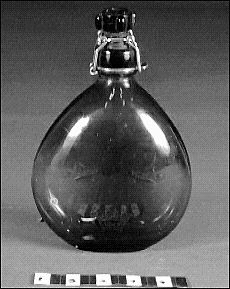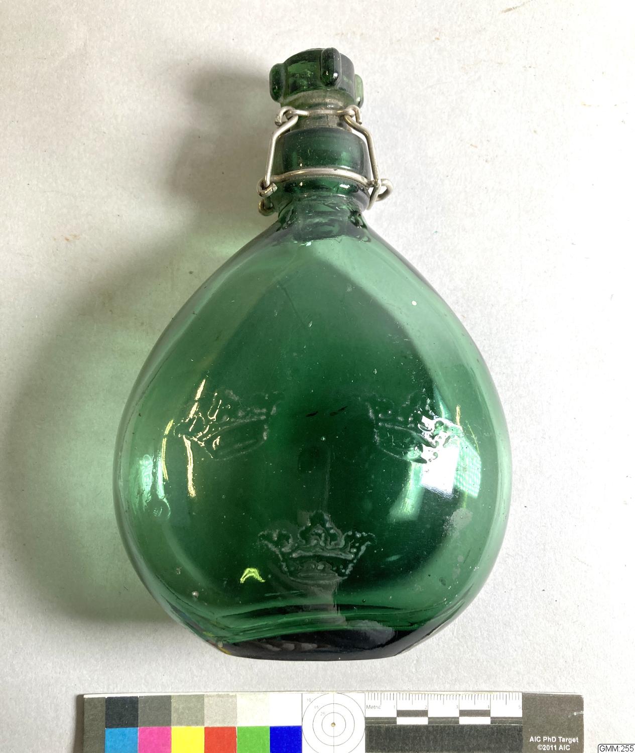 Grön fältflaska för manskap. Tre kronor i relief på glaset. Pressglas. Patentkork