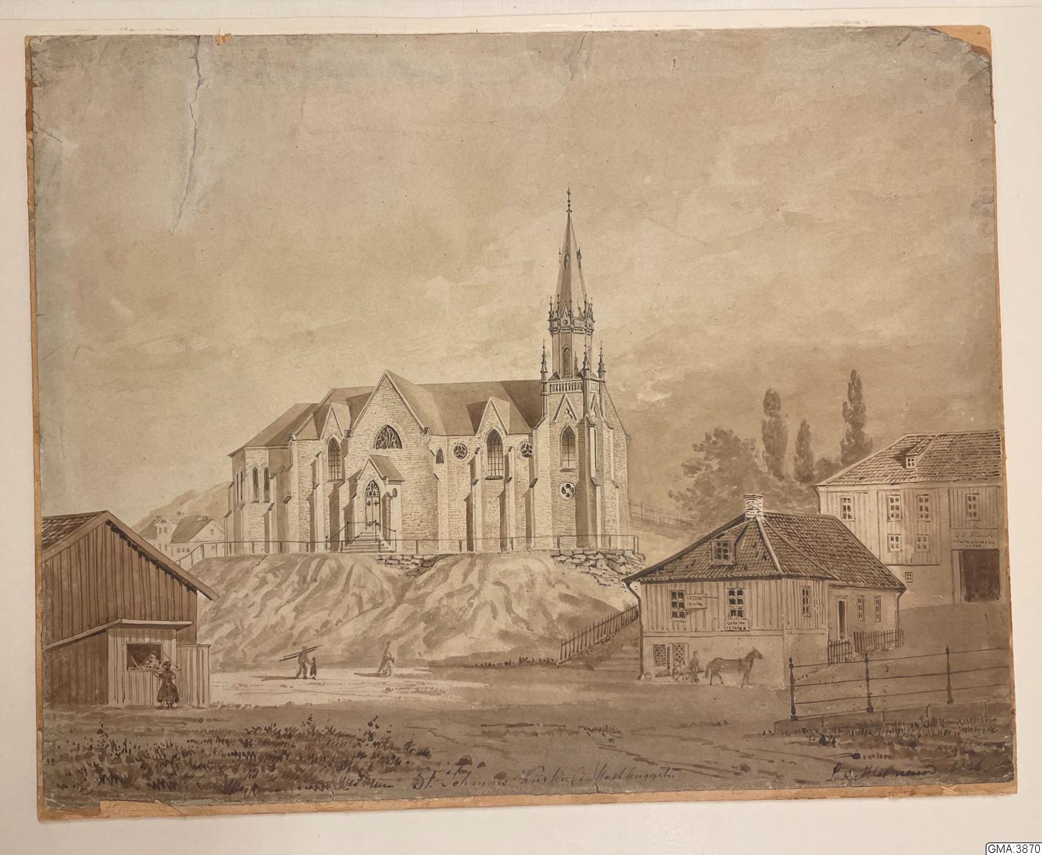 St. Johannes kyrka. Målning i sepia sign. Ludvig Messmann. Auktion efter Löwenadler. (Kat. nr. 618, D:6409, U:93.)